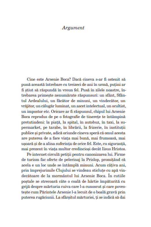 Am încercat să dau câteva răspunsuri scriindu-i povestea. Sunt încredințată că, dincolo de procesul de canonizare a lui Arsenie Boca și de controversele pe care acesta le stârnește, dincolo de turismul religios și de politicile bisericești, biografia lui este cel puțin la fel de pasionantă ca un pelerinaj la locurile secrete din noi înșine, unde se nasc deopotrivă spaimele și speranțele.“ — TATIANA NICULESCU