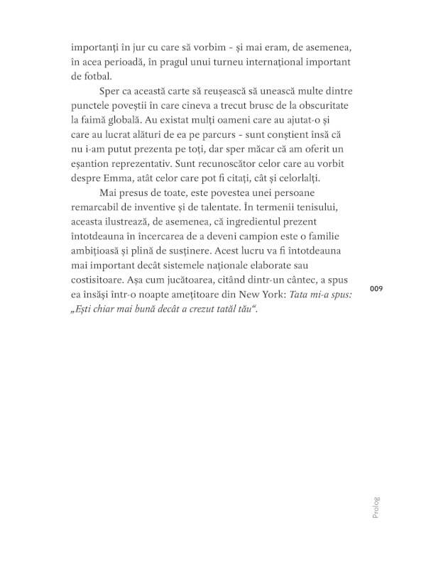 Mike Dickson prezintă interviuri cu martorii cei mai importanți ai evoluției lui Răducanu, reușind să ne ofere filmul acestei ascensiuni impresionante, începând cu copilăria Emmei, interesul ei pentru diverse sporturi, apoi îndrăgostirea de tenis și anii de muncă asiduă și dăruire care au urmat, cariera de junioară cu suișurile și coborârile ei, care a dus-o în cele din urmă în circuitul internațional.