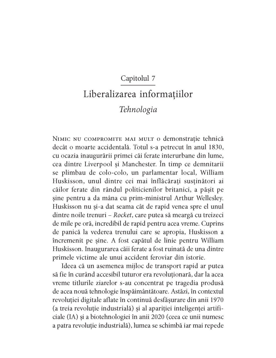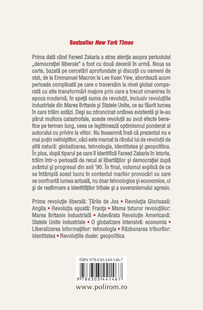 Prima dată când Fareed Zakaria a atras atenţia asupra pericolului „democraţiei iliberale” a fost cu două decenii în urmă. Noua sa carte, bazată pe cercetări aprofundate şi discuţii cu oameni de stat, de la Emmanuel Macron la Lee Kuan Yew, abordează acum perioada complicată pe care o traversăm la nivel global comparată cu alte transformări majore prin care a trecut omenirea în epoca modernă, în speţă suma de revoluţii, inclusiv revoluţiile industriale din Marea Britanie şi Statele Unite, ce au făurit lumea în care trăim astăzi. Deşi au zdruncinat ordinea existentă şi le-au părut multora catastrofale, aceste revoluţii au avut efecte benefice pe termen lung, ceea ce legitimează optimismul ponderat al autorului cu privire la viitor. Nu înseamnă însă că prezentul nu e mai puţin neliniştitor, căci este marcat la rândul lui de revoluţii de altă natură: globalizarea, tehnologia, identitatea şi geopolitica. În plus, după tiparul pe care îl identifică Fareed Zakaria în istorie, trăim într-o perioadă de recul al libertăţilor şi democraţiei după avântul şi progresul din anii ’90. În final, volumul explică de ce se întâmplă acest lucru în contextul marilor provocări cu care se confruntă lumea actuală, nu doar tehnologice şi economice, ci şi de reafirmare a identităţilor tribale şi a suveranismului agresiv.