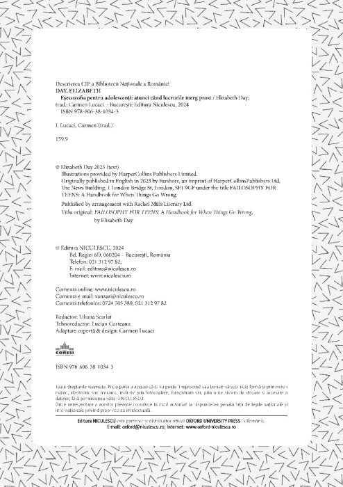 Cartea de faţă este un ghid practic, util și deosebit de prietenos care se adresează adolescenților, ajutându-i pe aceștia să capete încredere în ei şi să se descurce în momentele când lucrurile nu merg conform planului. În Eșecozofia pentru adolescenți, Elizabeth Day îţi împărtășește nu doar propriile experiențe, ci și poveștile personale ale invitaților pe care i-a avut în podcastul ei de mare succes, How To Fail, încurajându-te să îmbrățișezi eșecul ca pe o excelentă oportunitate de a învăța mai mult.