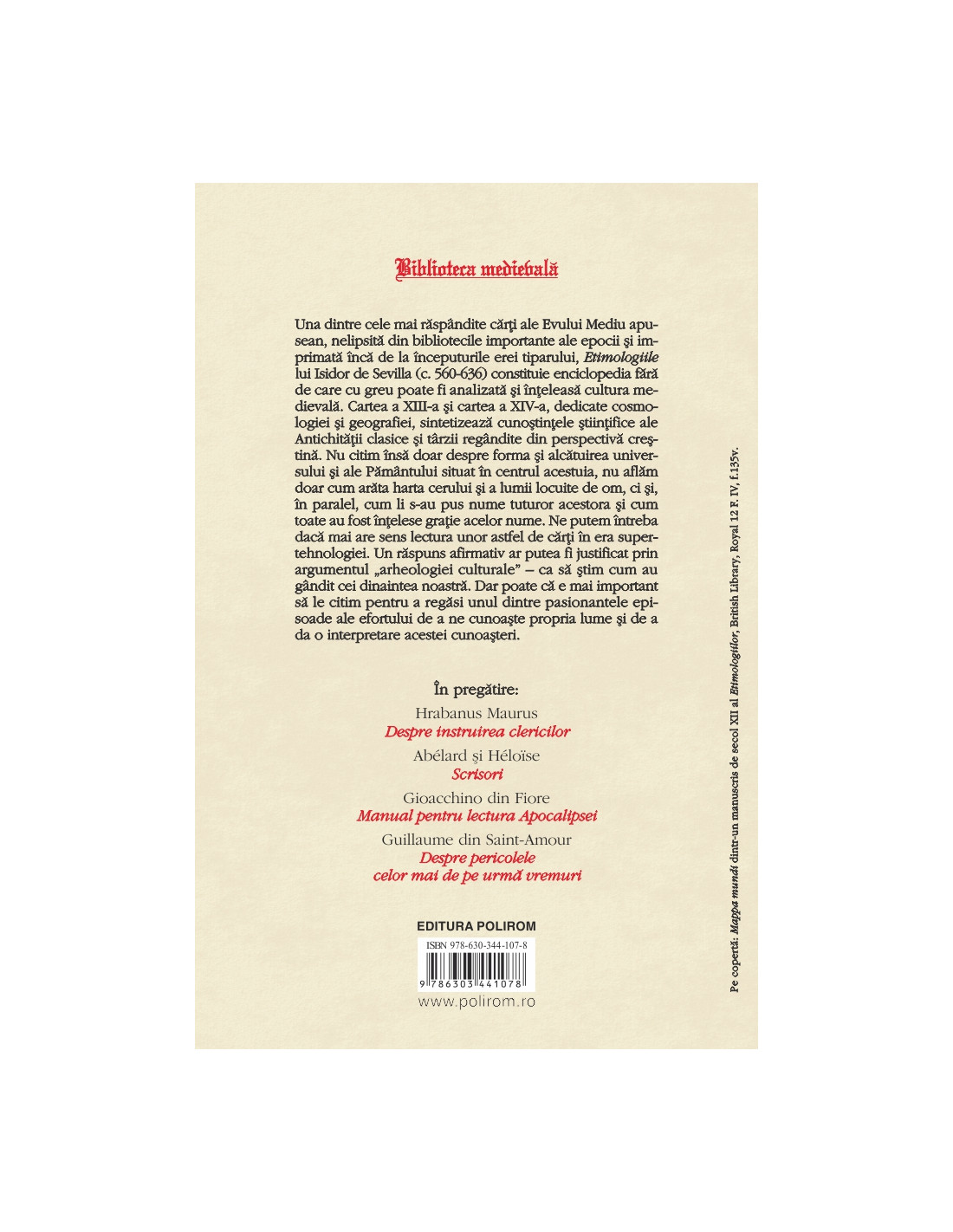 Una dintre cele mai răspândite cărți ale Evului Mediu apusean, nelipsită din bibliotecile importante ale epocii și imprimată încă de la începuturile erei tiparului, Etimologiile lui Isidor de Sevilla (c. 560-636) constituie enciclopedia fără de care cu greu poate fi analizată și înțeleasă cultura medievală.