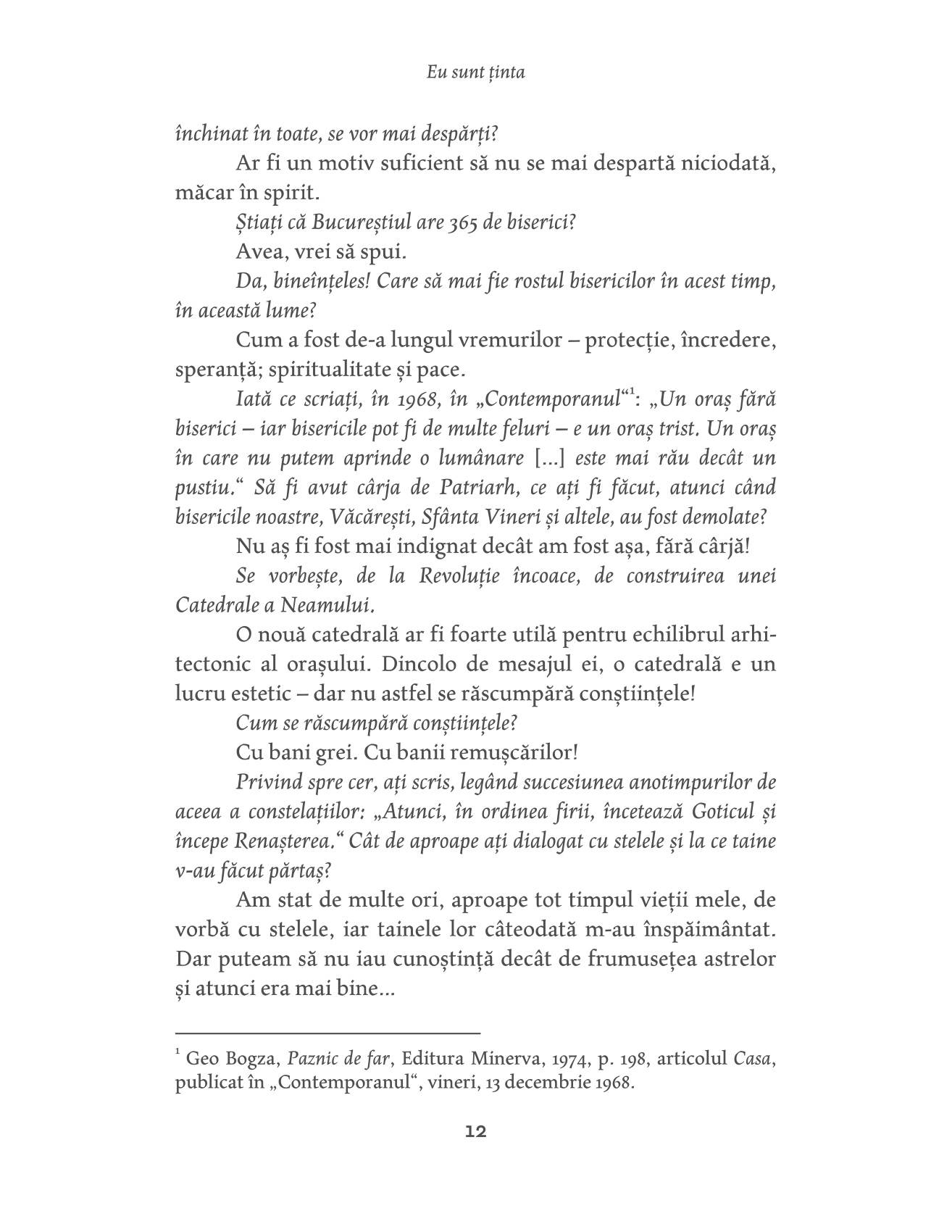 Este o parte grăitoare pentru întreg, grăitoare pentru luciditatea cu care Geo Bogza a comentat până la sfârșit spectacolul istoric și comedia umană; grăitoare pentru demnitatea, pentru seninătatea, pentru veghea neobosită a paznicului de far." Sorin Vieru