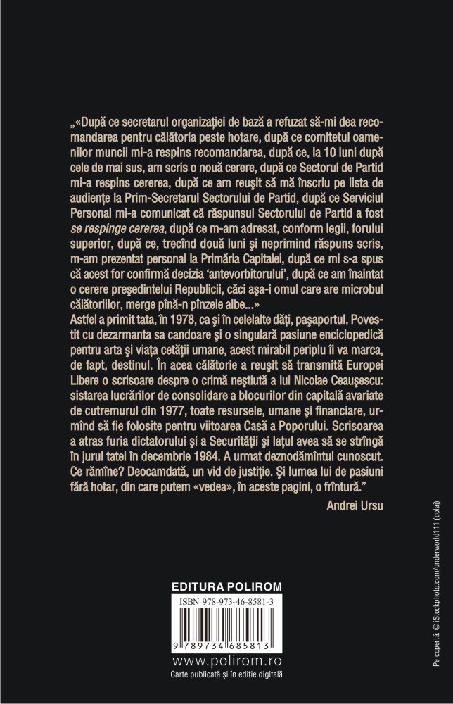 Astfel a primit tata, în 1978, ca şi în celelalte dăţi, paşaportul. Povestit cu dezarmanta sa candoare şi o singulară pasiune enciclopedică pentru arta şi viaţa cetăţii umane, acest mirabil periplu îi va marca, de fapt, destinul. În acea călătorie a reuşit să transmită Europei Libere o scrisoare despre o crimă neştiută a lui Nicolae Ceauşescu: sistarea lucrărilor de consolidare a blocurilor din capitală avariate de cutremurul din 1977, toate resursele, umane şi financiare, urmând să fie folosite pentru viitoarea Casă a Poporului. Scrisoarea a atras furia dictatorului şi a Securităţii şi laţul avea să se strângă în jurul tatei în decembrie 1984. A urmat deznodământul cunoscut. Ce rămâne? Deocamdată, un vid de justiţie. Şi lumea lui de pasiuni fără hotar, din care putem «vedea», în aceste pagini, o frântură.” (Andrei Ursu)