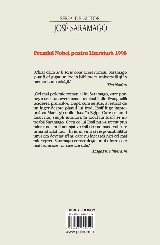 „Cel mai polemic roman al lui Saramago, care pornește de la un eveniment abominabil din Evanghelii: uciderea pruncilor. După cum se știe, avertizat de un înger despre planul lui Irod, Iosif fuge împreună cu Maria și copilul Isus în Egipt. Oare ce am fi făcut noi, simpli muritori, în locul lui Iosif? se întreabă Saramago. Ceea ce lui Iosif nu i-a trecut prin minte: ne-am fi anunțat vecinii despre masacrul care urma să aibă loc... În jurul vinii și responsabilității unui om devenit sfânt, care nu încearcă nici cel mai mic regret, Saramago construiește unul dintre cele mai frumoase romane ale sale.“ (Magazine littéraire)