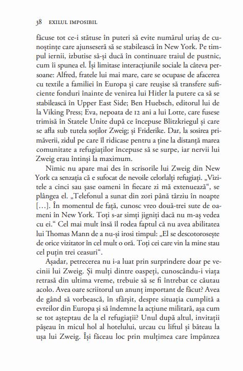 Exilul imposibil, povestea vieții sfârșite tragic a lui Stefan Zweig, înfățișează prăpastia dintre lumea ideilor bătrânei Europe și cea a tinerei Americi, precum și zbuciumul celor care s-au văzut nevoiți s-o abandoneze pe una pentru cealaltă. Destinul lui Zweig este emblematic, până la urmă, pentru o epocă ce se sfârșește și o lume care se surpă în ea însăși, pe măsură ce-și pierde valorile.