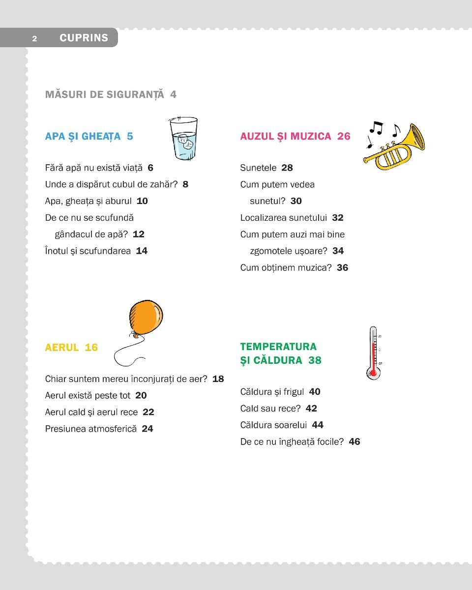 Pornind de la întrebările simple pe care le pun copiii, cartea de faţă îi ajută pe micii cercetători să exploreze secretele fenomenelor din natură. Datorită acesteia, ştiinţele naturii sunt mai interesante şi mult mai uşor de înţeles. Experimentele prezentate fac vizibile aerul şi sunetul, arată puterea soarelui sau culorile curcubeului si demonstrează cum funcţionează pârghiile şi forţa magnetică.