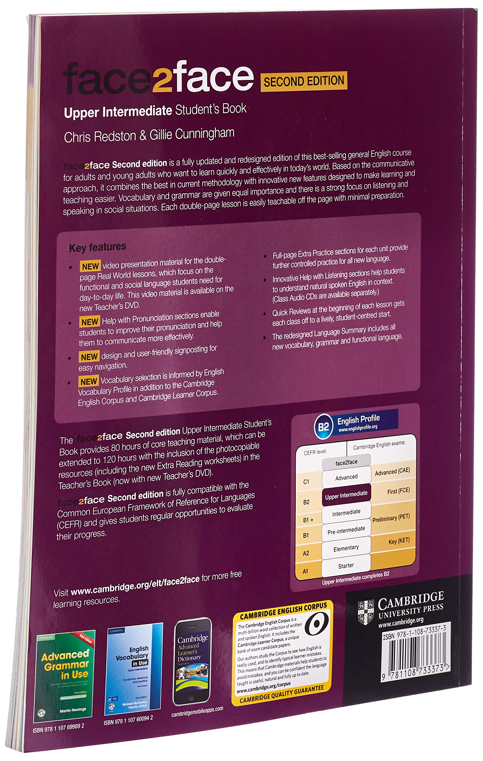 The Upper Intermediate Student's Book provides 80 hours of core teaching material, which can be extended to 120 hours with the inclusion of the photocopiable resources in the Teacher's Book (with Teacher's DVD). Vocabulary and Grammar are given equal importance and there is a clear focus on improving student's listening and speaking skills in social situations. The Student's Book includes optional video for the Real World lessons (available on the Teacher's DVD) with vocabulary selection informed by English Profile and the Cambridge Learner Corpus. (Please note that the face2face Second edition Class Audio CD's are available separately).