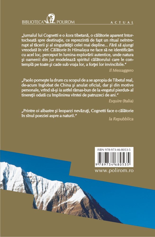„Jurnalul lui Cognetti e o kora tibetană, o călătorie aparent întortocheată spre destinaţie, ce reprezintă de fapt un ritual neîntrerupt al tăcerii şi al singurătăţii celei mai depline... Fără să ajungi vreodată în vîrf. Călătorie în Himalaya ne face să ne identificăm cu acel loc, perceput în lumina explorării autentice, unde natura şi oamenii din jur modelează spiritul călătorului care le contemplă pe toate şi cade sub vraja lor, a forţei lor invincibile.” (Il Messaggero)