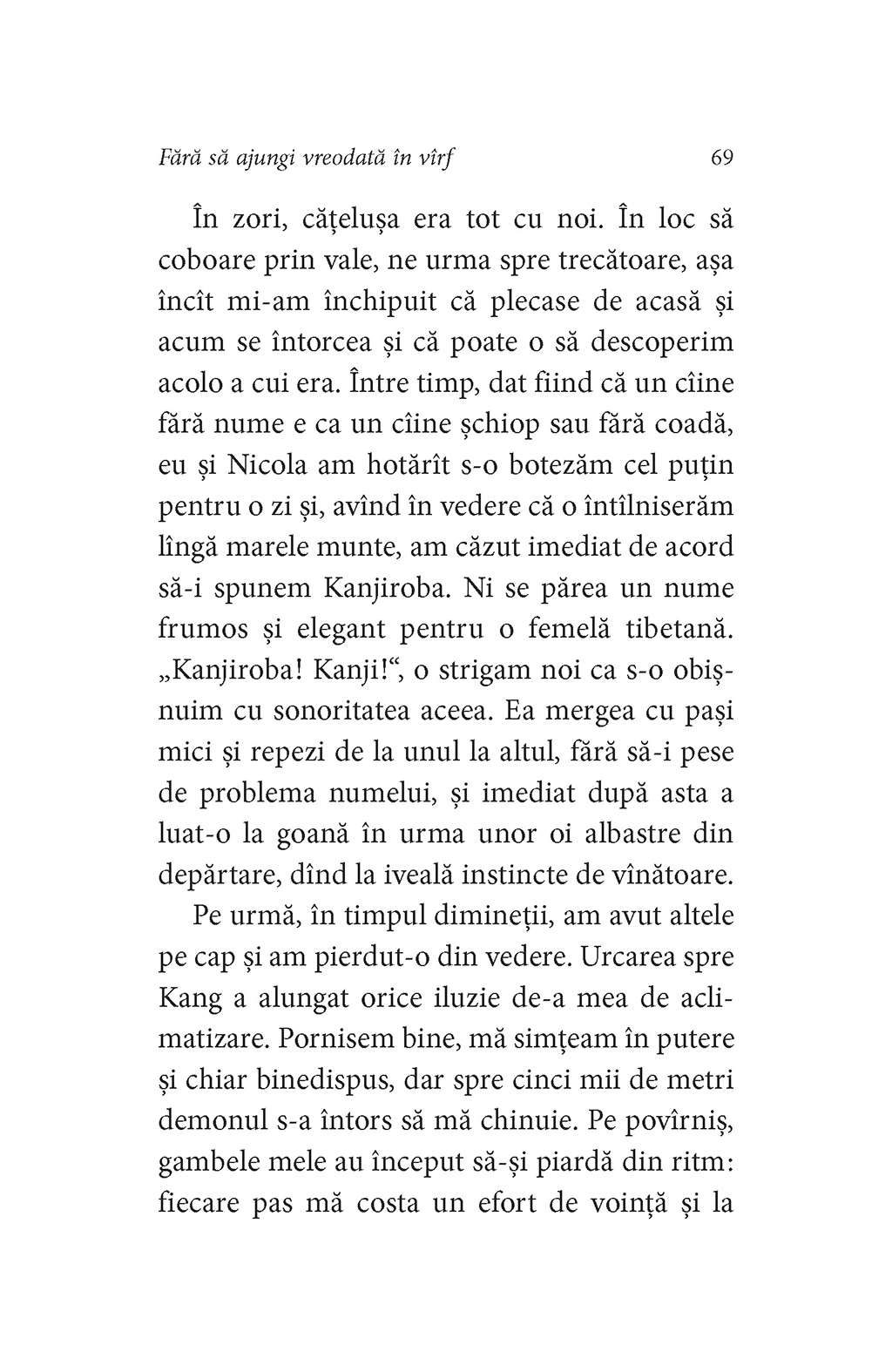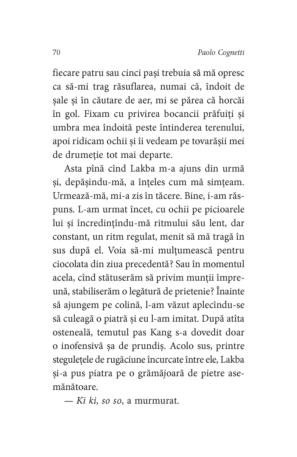 Cînd împlineşte patruzeci de ani, Paolo porneşte într-o călătorie în Himalaya, în regiunea Dolpo, alături de doi prieteni de aceeaşi vîrstă. Expediţia lor este mai mult decît un periplu printr-un loc aspru, maiestuos şi încă ferit de tumultul lumii contemporane. E în primul rînd un parcurs iniţiatic, o redescoperire a sinelui, ce uneori seamănă teribil cu un pelerinaj. Paolo porneşte la drum avînd în rucsac cartea cult a lui Peter Matthiessen, Leopardul de zăpadă, şi străbate aceleaşi locuri ca mentorul său dispărut, fiind frămîntat de aceleaşi întrebări şi confruntat cu aceeaşi măreţie a Himalayei. Aici, în Dolpo, în aerul tăios al înălţimilor, cei trei prieteni, însoţiţi de un grup de localnici, îşi redescoperă sufletul. Frigul, boala, întîlnirile cu călugării budişti sau cu sătenii din regiune, legăturile subtile care se creează între cei trei prieteni şi tovarăşii lor nepalezi sînt descrise de autor într-un ritm alert, ce nu ocoleşte explorările profunde ale propriei conştiinţe. Dar de ce să urci un munte fără să ajungi vreodată în vîrf? Pentru că, spune Cognetti, drumul e mult mai preţios decît piscul. Căci cine a văzut sacrul Kailash de pe creasta neprihănită a Muntelui de Cristal?