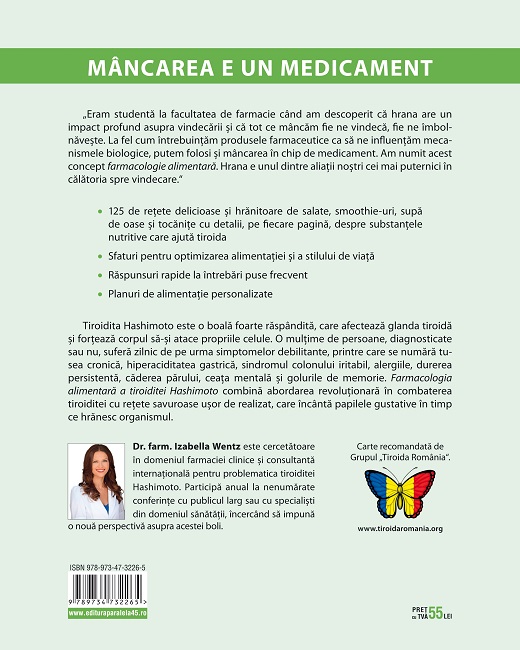 Tiroidita Hashimoto este o boală foarte răspândită, care afectează glanda tiroidă și forțează corpul să-și atace propriile celule. O mulțime de persoane, diagnosticate sau nu, suferă zilnic de pe urma simptomelor debilitante, printre care se numără tusea cronică, hiperaciditatea gastrică, sindromul colonului iritabil, alergiile, durerea persistentă, căderea părului, ceața mentală și golurile de memorie. Farmacologia alimentară a tiroiditei Hashimoto combină abordarea revoluționară în combaterea tiroiditei cu rețete savuroase ușor de realizat, care încântă papilele gustative în timp ce hrănesc organismul.