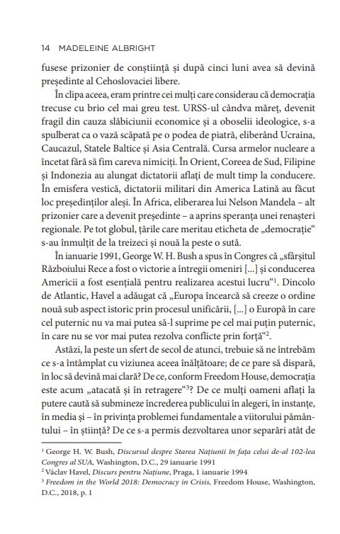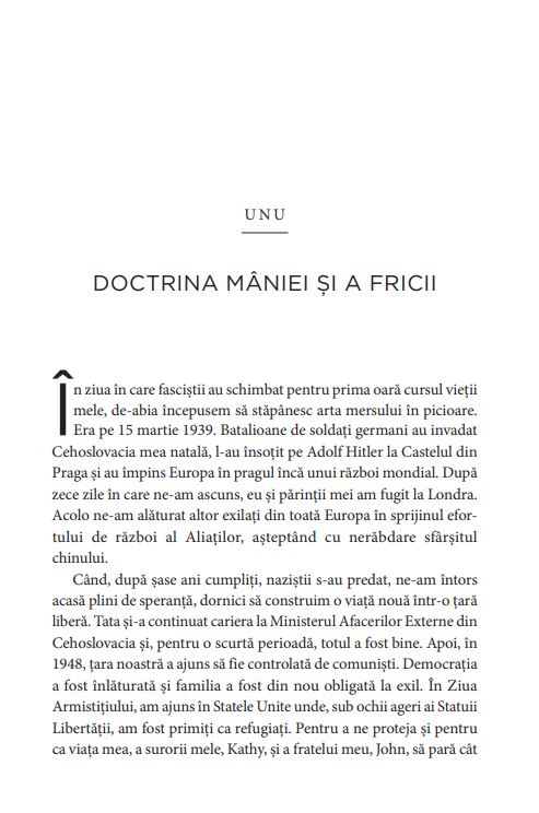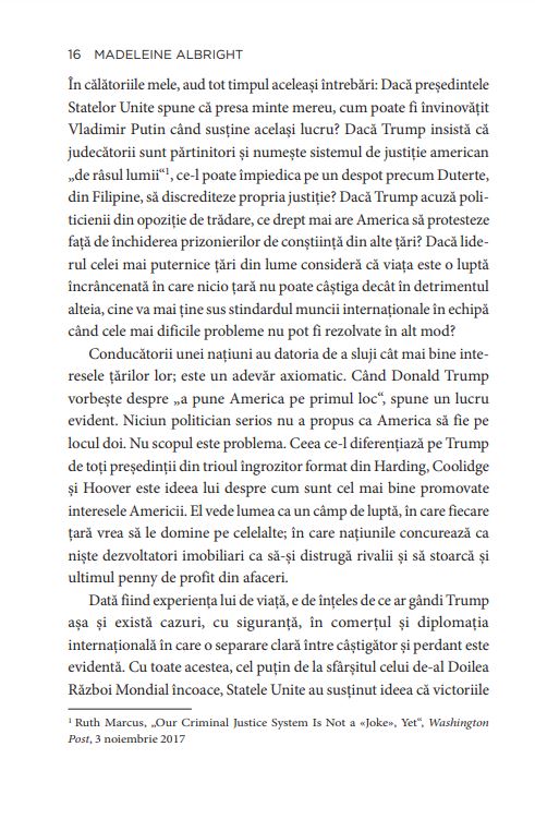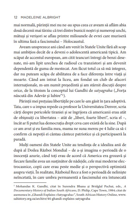 DESPRE AUTOARE: Madeleine Albright este unul dintre cei mai influenți politicieni și diplomați ai ultimelor decenii. Născută în Cehia, la 15 mai 1937, a fost prima femeie care a ocupat funcția de Secretar de Stat al Statelor Unite ale Americii, servind între 1997 și 2001, în timpul mandatului lui Bill Clinton. În perioada 1993 –1997, a fost ambasadorul Statelor Unite la ONU. A scris o serie de cărți, printre care: The Mighty and the Almighty: Reflections on America, God, and World Affairs (2006), Memo to the President Elect (2008), Prague Winter: A Personal Story of Remembrance and War, 1937–1948 (2012).