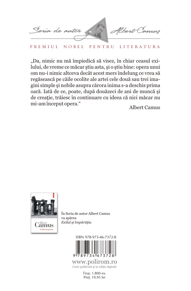 „Da, nimic nu mă împiedică să visez, în chiar ceasul exilului, de vreme ce măcar ştiu asta, şi o ştiu bine: opera unui om nu‑i nimic altceva decît acest mers îndelung ce vrea să regăsească pe căile ocolite ale artei cele două sau trei imagini simple şi nobile asupra cărora inima s‑a deschis prima oară. Iată de ce, poate, după douăzeci de ani de muncă şi de creaţie, trăiesc în continuare cu ideea că nici măcar nu mi‑am început opera.” (Albert Camus)