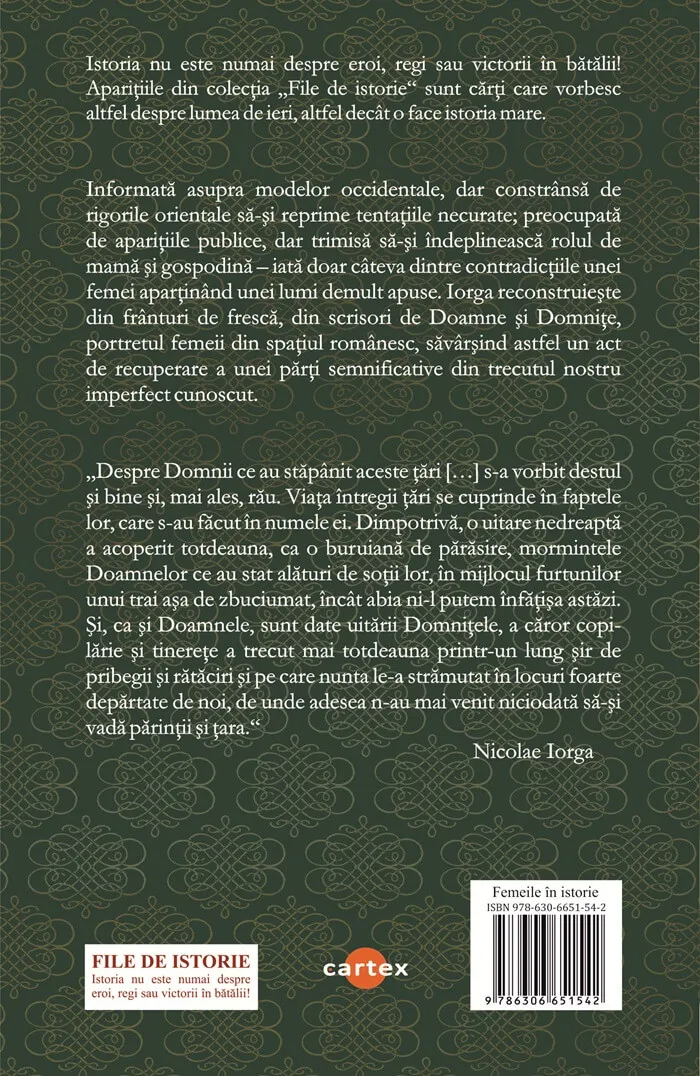 Informata asupra modelor occidentale, dar constransa de rigorile orientale sa-si reprime tentatiile necurate; preocupata de aparitiile publice, dar trimisa sa-si indeplineasca rolul de mama si gospodina – iata doar cateva dintre contradictiile unei femei apartinand unei lumi demult apuse. Iorga reconstruieste din franturi de fresca, din scrisori de Doamne si Domnite, portretul femeii din spatiul romanesc, savarsind astfel un act de recuperare a unei parti semnificative din trecutul nostru imperfect cunoscut.