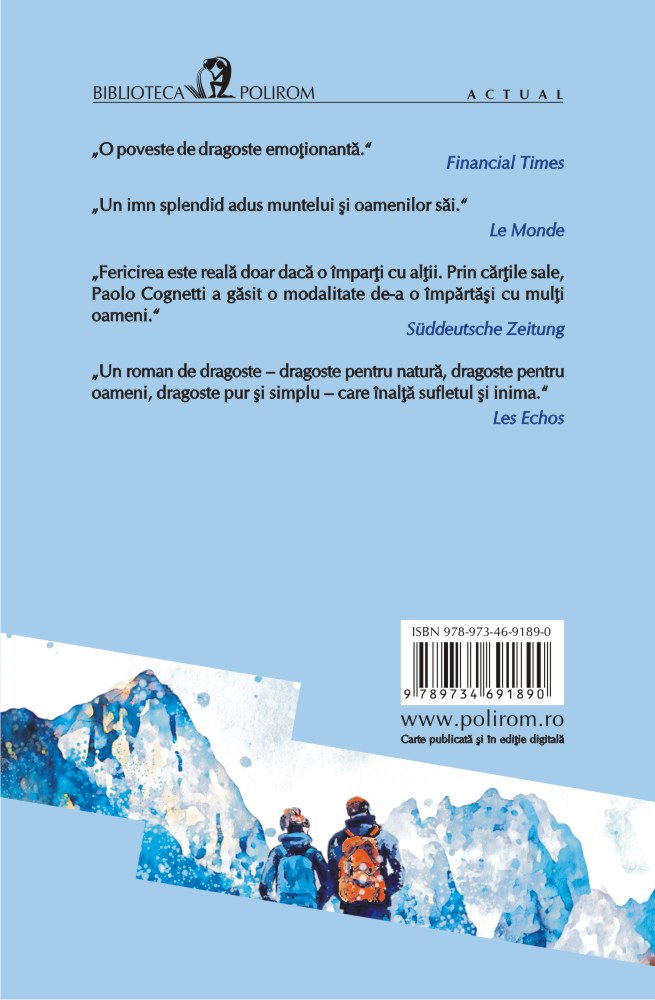 După succesul mondial al romanului Cei opt munţi, Paolo Cognetti se întoarce pe îndrăgitele sale piscuri de munte pentru a ne oferi un roman de dragoste uluitor, o adevărată odă închinată muntelui, deopotrivă liniştitor, periculos, imprevizibil şi plin de forţă. Fausto s-a refugiat în munţi pentru că voia să lase în urmă trecutul recent. Silvia încearcă să descopere ceva despre sine înainte să plece cine ştie unde. El are patruzeci de ani, ea – douăzeci şi şapte. Se apropie unul de altul într-o noapte când Fontana Fredda se pregăteşte de iarnă. În jurul lor se află Babette şi restaurantul ei, apoi un refugiu situat la peste trei mii de metri altitudine şi Santorso, care ştie totul despre vale, întinderi de zăpadă şi de iarbă ce îţi umplu sufletul. Chiar şi lupul, care nu-şi mai făcuse apariţia de un secol, pare că s-a întors. Şi el este în căutarea fericirii.