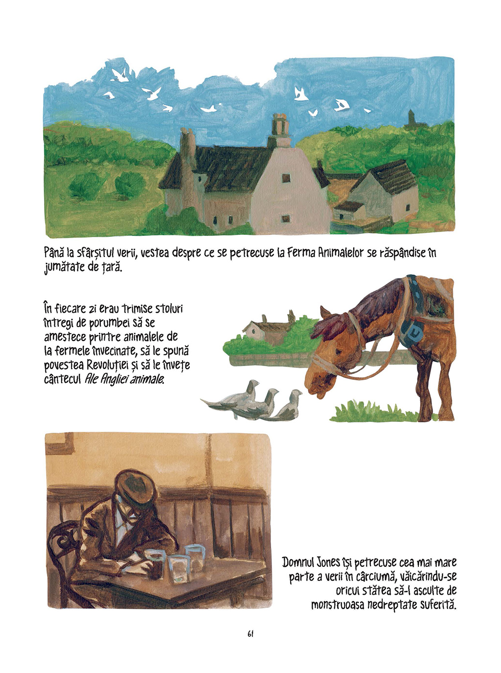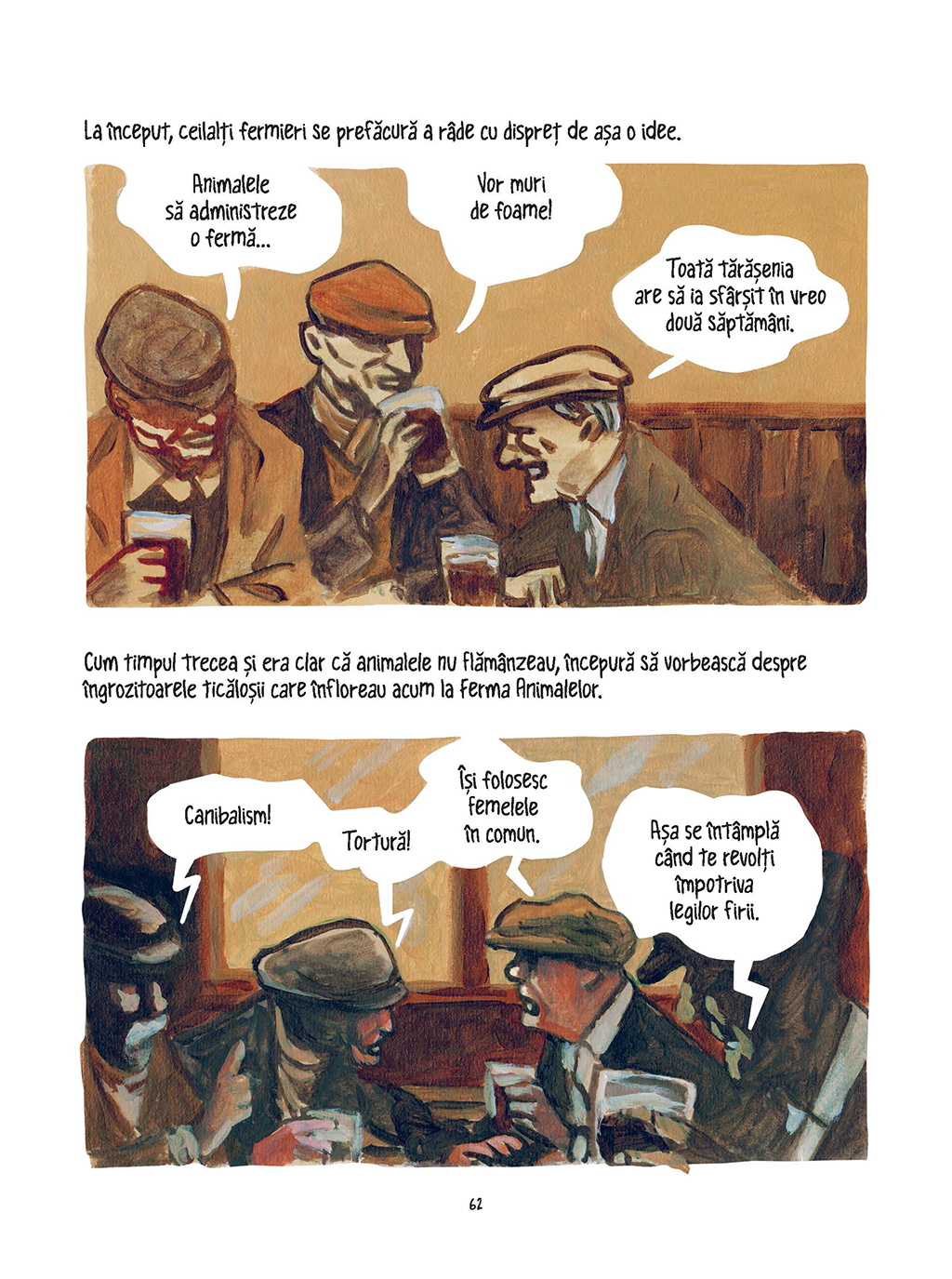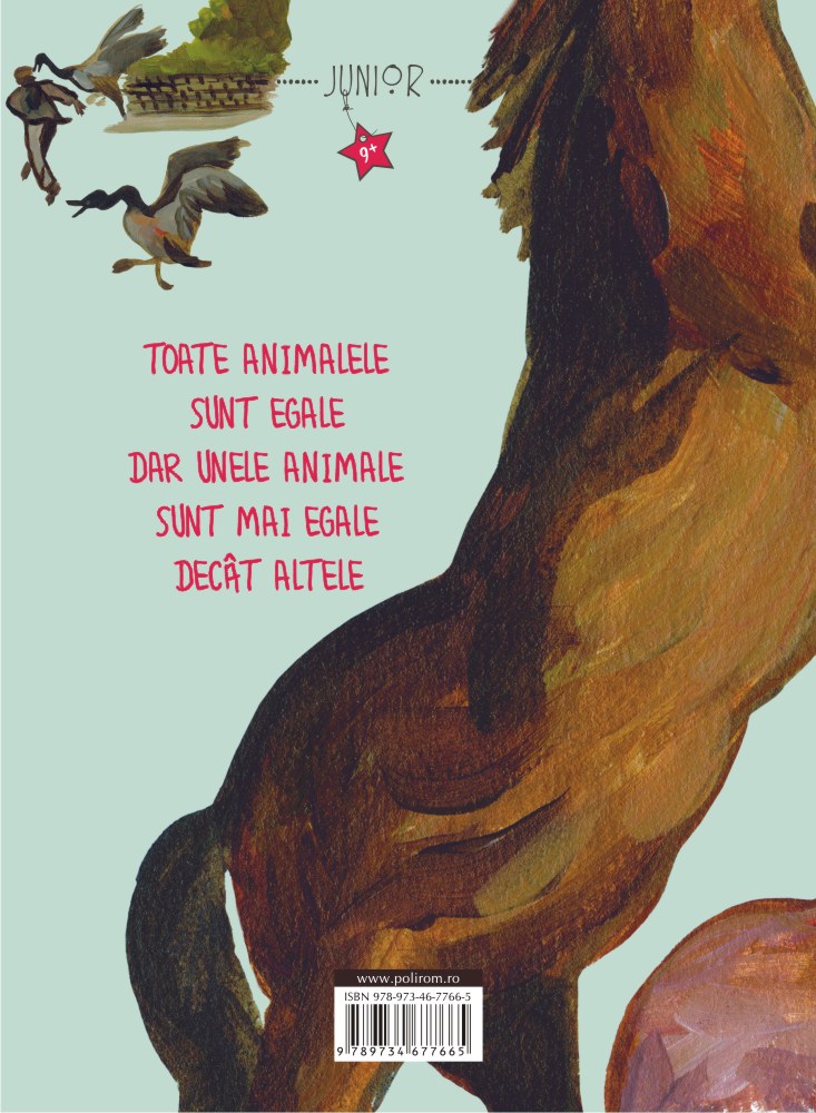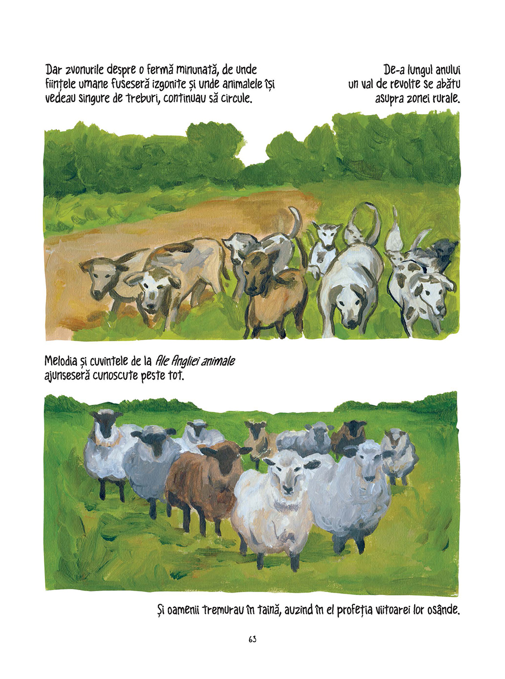 Cînd animalele de la fermă îşi alungă stăpînul beţiv, toate sînt cuprinse de un zel colectiv. Fiecare munceşte peste program, astfel productivitatea creşte şi, pentru moment, gurile sînt sătule. Regulile de aur ale colectivităţii vor fi înscrise cu litere uriaşe pe un hambar: toate animalele sînt egale, nici un animal să nu bea alcool, să nu poarte haine, să nu doarmă în pat, să nu-şi ucidă semenii. Dar nu trece mult pînă cînd porcii preiau conducerea fermei şi se bucură de privilegiile puterii. Punctul culminant, o subtilă ironie la adresa regimului comunist, poate fi înţeles fie şi numai din ultima regulă care mai rămîne înscrisă pe hambar: „Toate animalele sînt egale, dar unele animale sînt mai egale decît altele”.