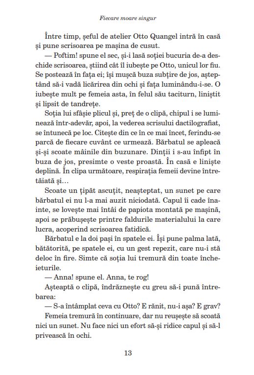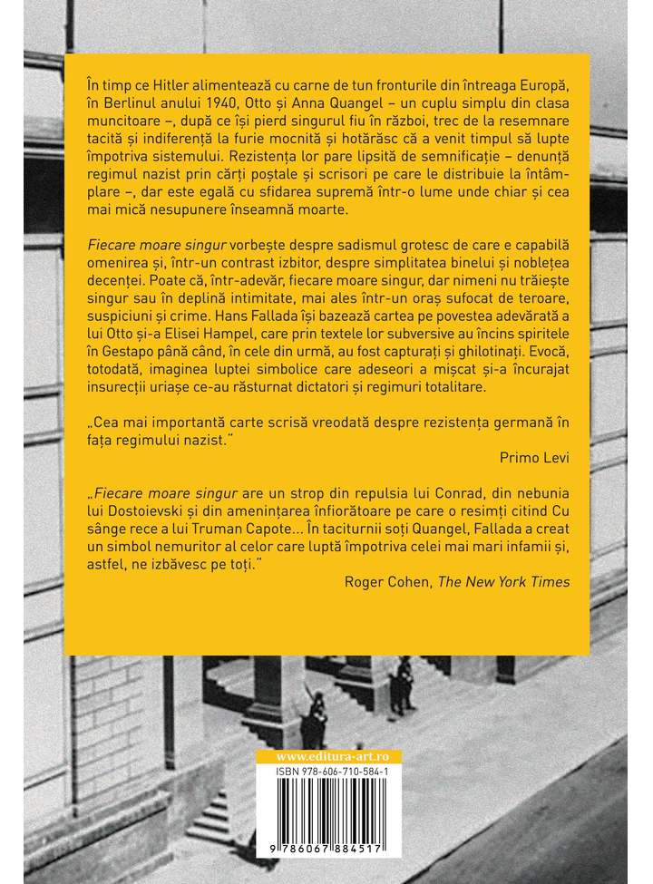 „Fiecare moare singur are un strop din repulsia lui Conrad, din nebunia lui Dostoievski și din amenințarea înfiorătoare pe care o resimți citind Cu sânge rece a lui Truman Capote... În taciturnii soți Quangel, Fallada a creat un simbol nemuritor al celor care luptă împotriva celei mai mari infamii și, astfel, ne izbăvesc pe toți.” (Roger Cohen, The New York Times)
