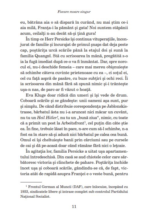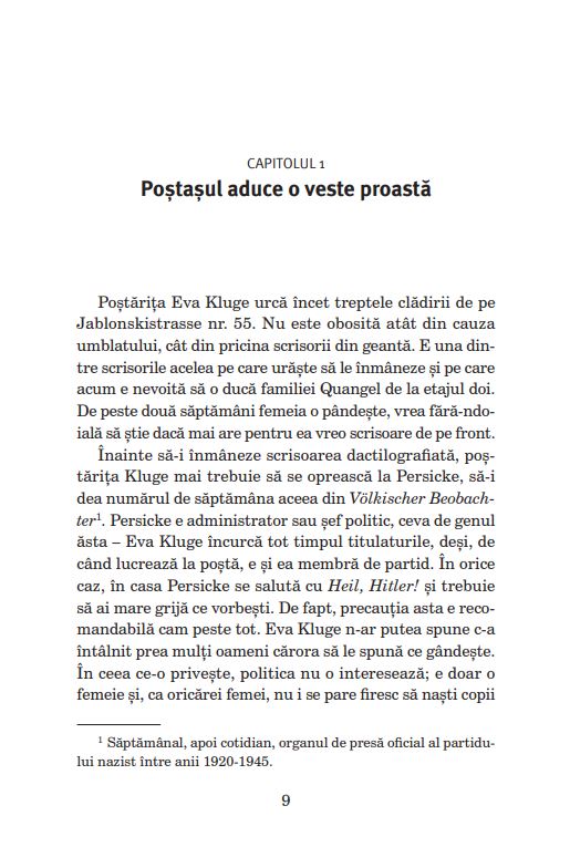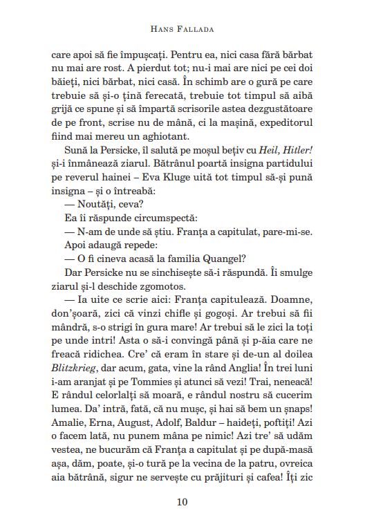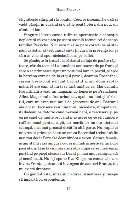 În timp ce Hitler alimentează cu carne de tun fronturile din întreaga Europă, în Berlinul anului 1940, Otto și Anna Quangel – un cuplu simplu din clasa muncitoare –, după ce își pierd singurul fiu în război, trec de la resemnare tacită și indiferență la furie mocnită și hotărăsc că a venit timpul să lupte împotriva sistemului. Rezistența lor pare lipsită de semnificație – denunță regimul nazist prin cărți poștale și scrisori pe care le distribuie la întâmplare –, dar este egală cu sfidarea supremă într-o lume unde chiar și cea mai mică nesupunere înseamnă moarte.