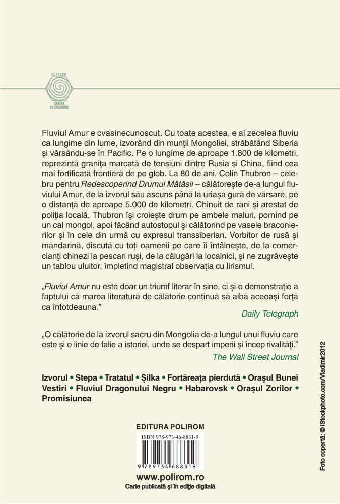 Fluviul Amur e cvasinecunoscut. Cu toate acestea, e al zecelea fluviu ca lungime din lume, izvorând din munții Mongoliei, străbătând Siberia și vărsându-se în Pacific. Pe o lungime de aproape 1.800 de kilometri, reprezintă granița marcată de tensiuni dintre Rusia și China, fiind cea mai fortificată frontieră de pe glob. La 80 de ani, Colin Thubron – celebru pentru Redescoperind Drumul Mătăsii – călătorește de-a lungul fluviului Amur, de la izvorul său ascuns până la uriașa gură de vărsare, pe o distanță de aproape 5.000 de kilometri. Chinuit de răni și arestat de poliția locală, Thubron își croiește drum pe ambele maluri, pornind pe un cal mongol, apoi făcând autostopul și călătorind pe vasele braconierilor și în cele din urmă cu expresul transsiberian. Vorbitor de rusă și mandarină, discută cu toți oamenii pe care îi întâlnește, de la comercianți chinezi la pescari ruși, de la călugări la localnici, și ne zugrăvește un tablou uluitor, împletind magistral observația cu lirismul.