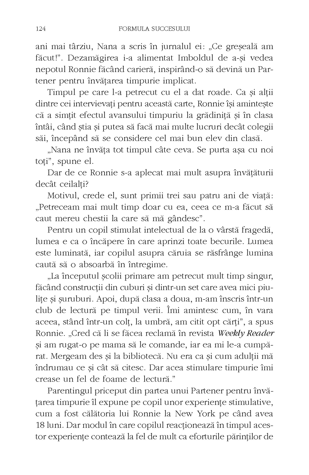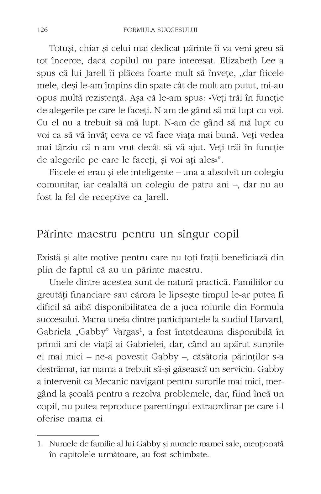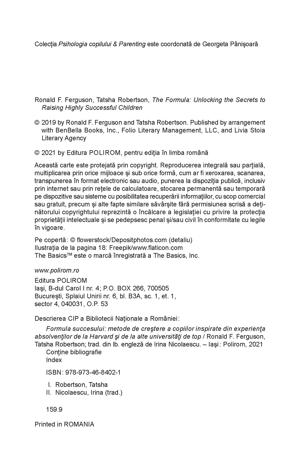 De ce, pentru unii, succesul pare să vină atît de ușor? Există o formulă de parenting care să creeze cu certitudine adulți remarcabili și realizați? Bazată pe cele mai recente cercetări științifice, cartea de față îți arată că, încă de la nașterea copilului tău, deciziile în ce privește creșterea lui pot avea o influență fundamentală. În urma unor interviuri desfășurate pe parcursul a 15 ani cu 200 de studenți de la Harvard sau de la alte universități prestigioase, precum și cu unii dintre părinții lor, autorii au descoperit că pot fi descrise opt tipare în care se încadrează stilurile de parenting, ce nu au nicio legătură cu mediul din care provin părinții, cu naționalitatea sau cu rasa lor, ba chiar, în majoritatea cazurilor, nici măcar cu nivelul lor de educație. Aceste stiluri de parenting pot fi învățate de orice părinte sau educator interesat, astfel încît, chiar dacă nu toți copiii vor deveni muzicieni celebri, absolvenți de Harvard sau oameni de afaceri bogați, formula succesului le va îmbunătăți cu siguranță rezultatele la școală și șansele de a avea o viață fericită și plină de sens.