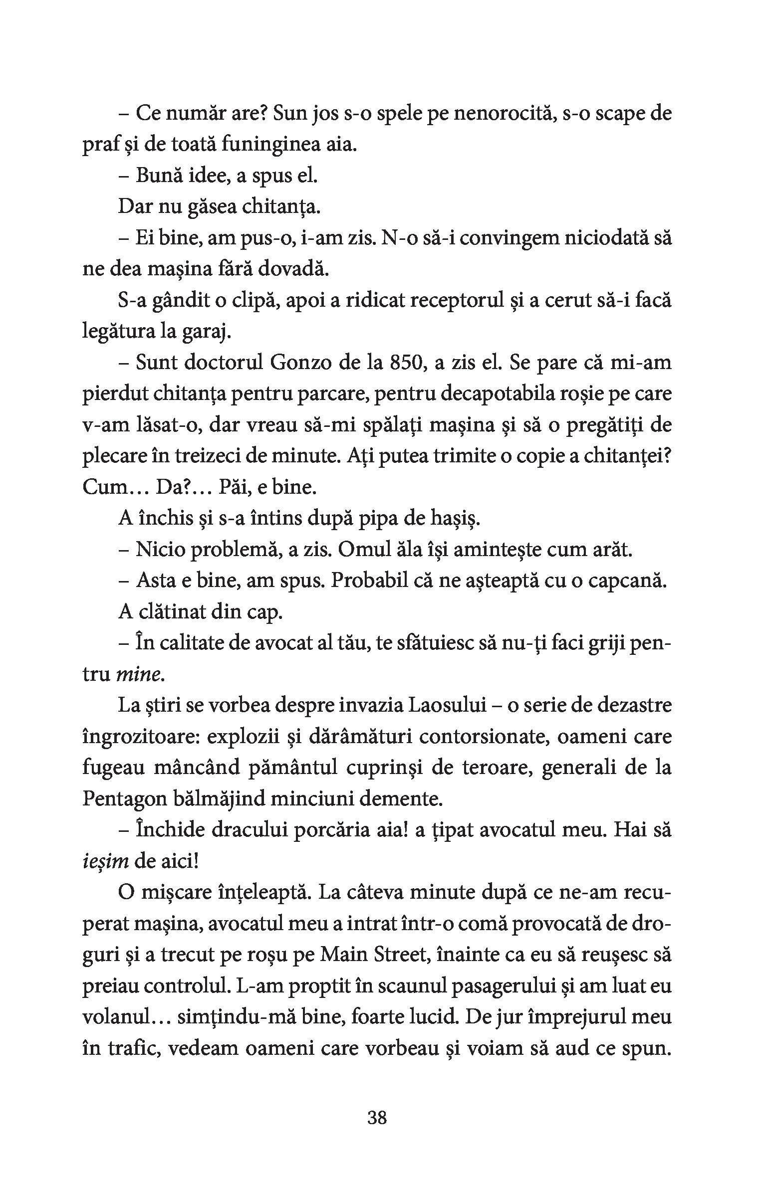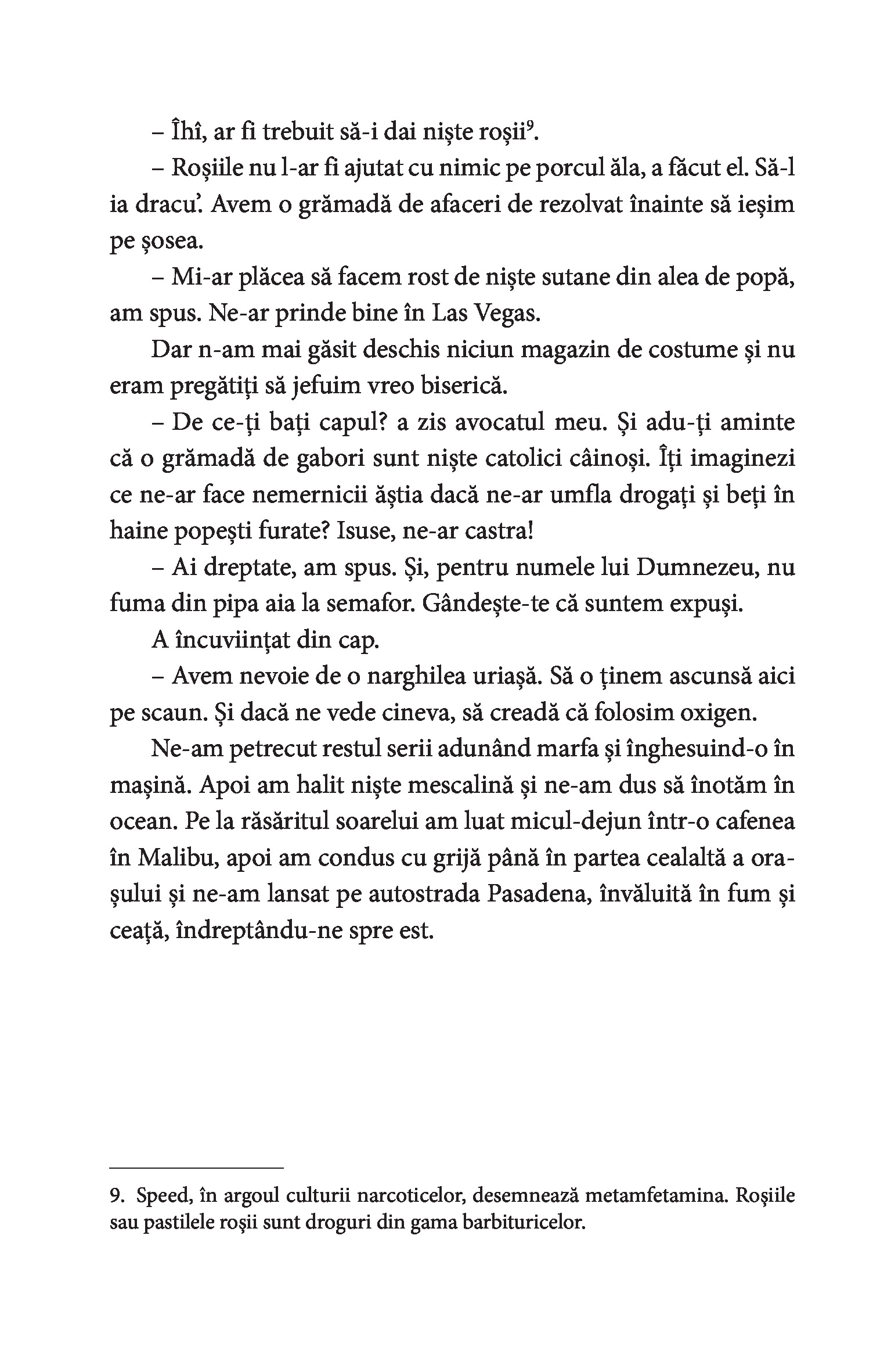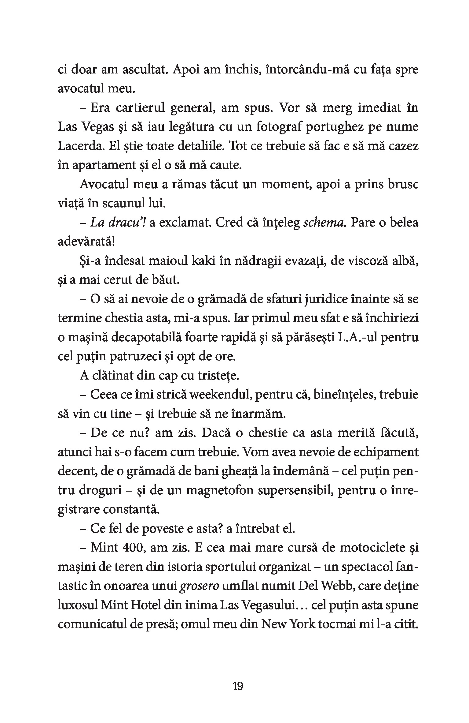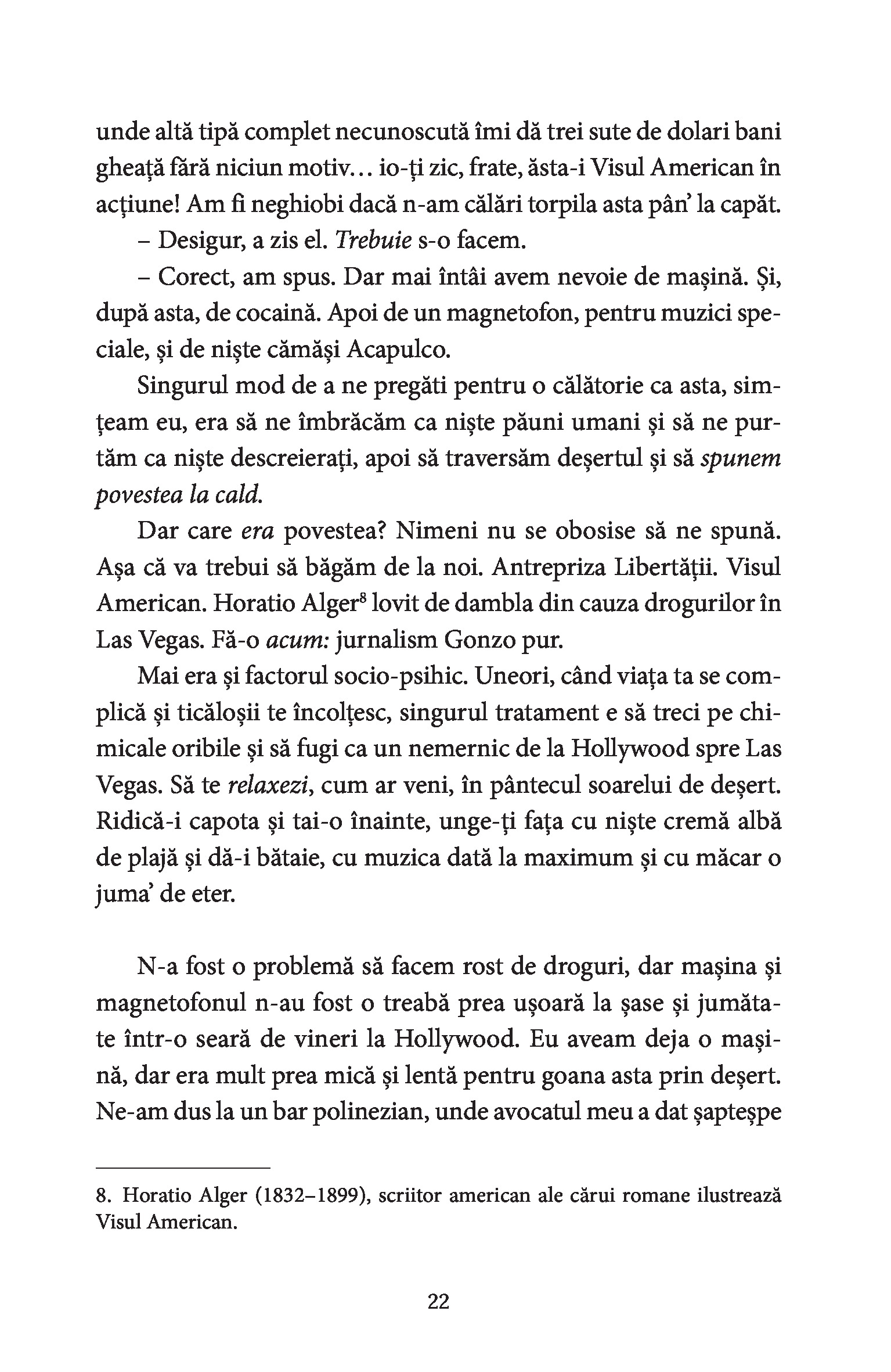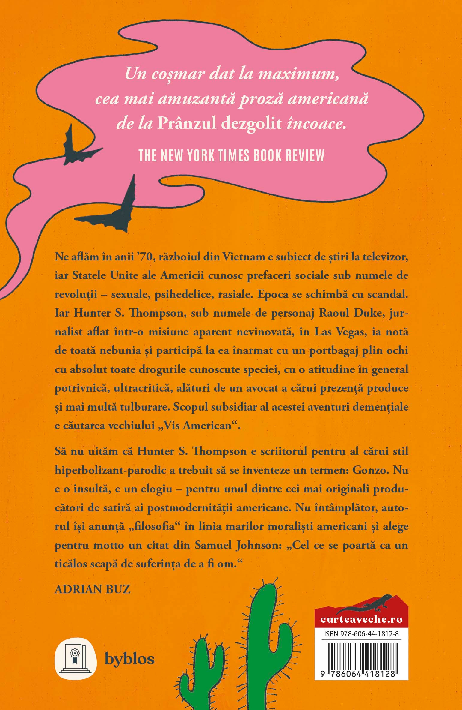 Să nu uităm că Hunter S. Thompson e scriitorul pentru al cărui stil hiperbolizant-parodic a trebuit să se inventeze un termen: Gonzo. Nu e o insultă, e un elogiu – pentru unul dintre cei mai originali producători de satiră ai postmodernității americane. Nu întâmplător, autorul își anunță „filosofia“ în linia marilor moraliști americani și alege pentru motto un citat din Samuel Johnson: „Cel ce se poartă ca un ticălos scapă de suferința de a fi om.“