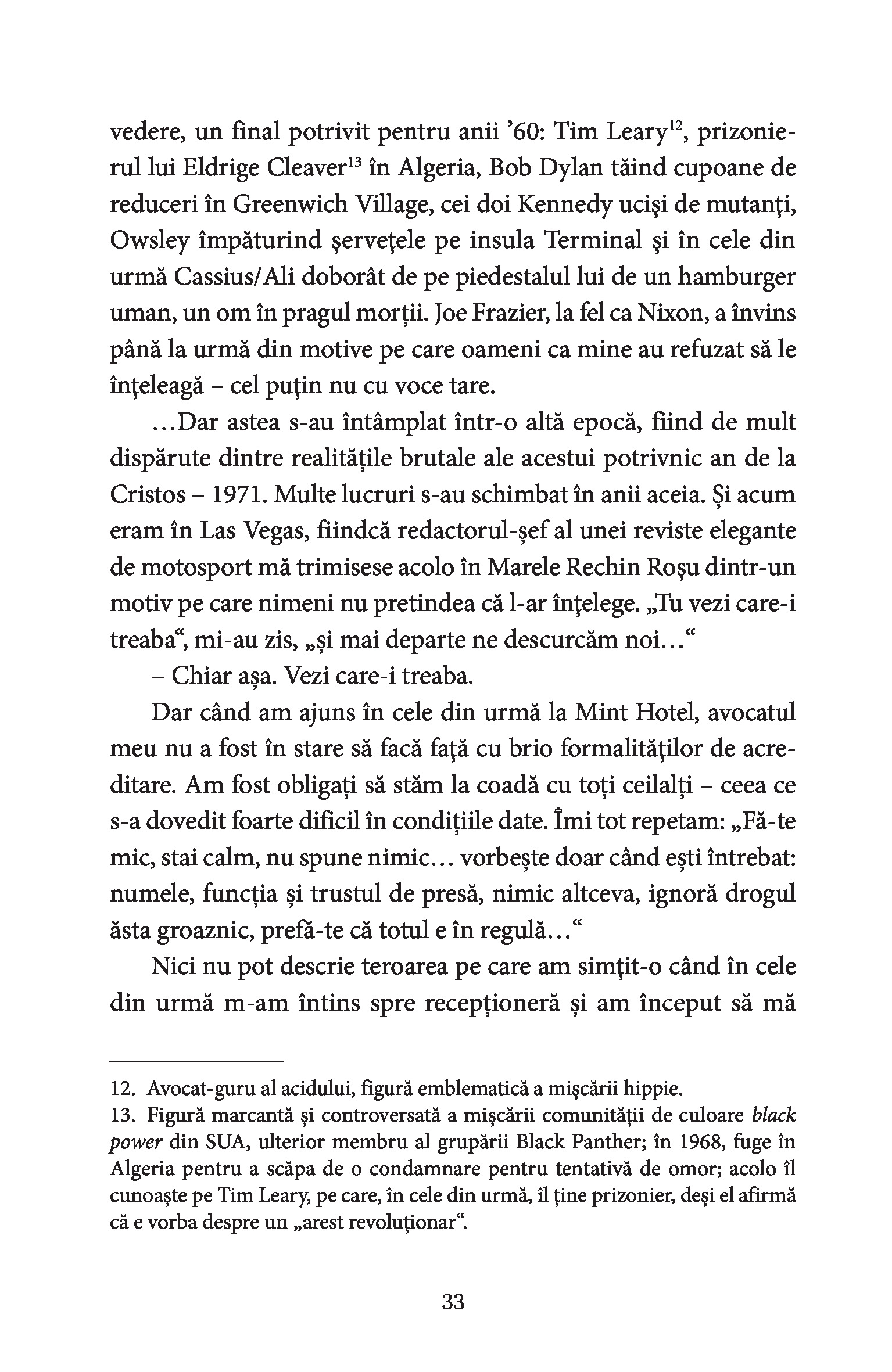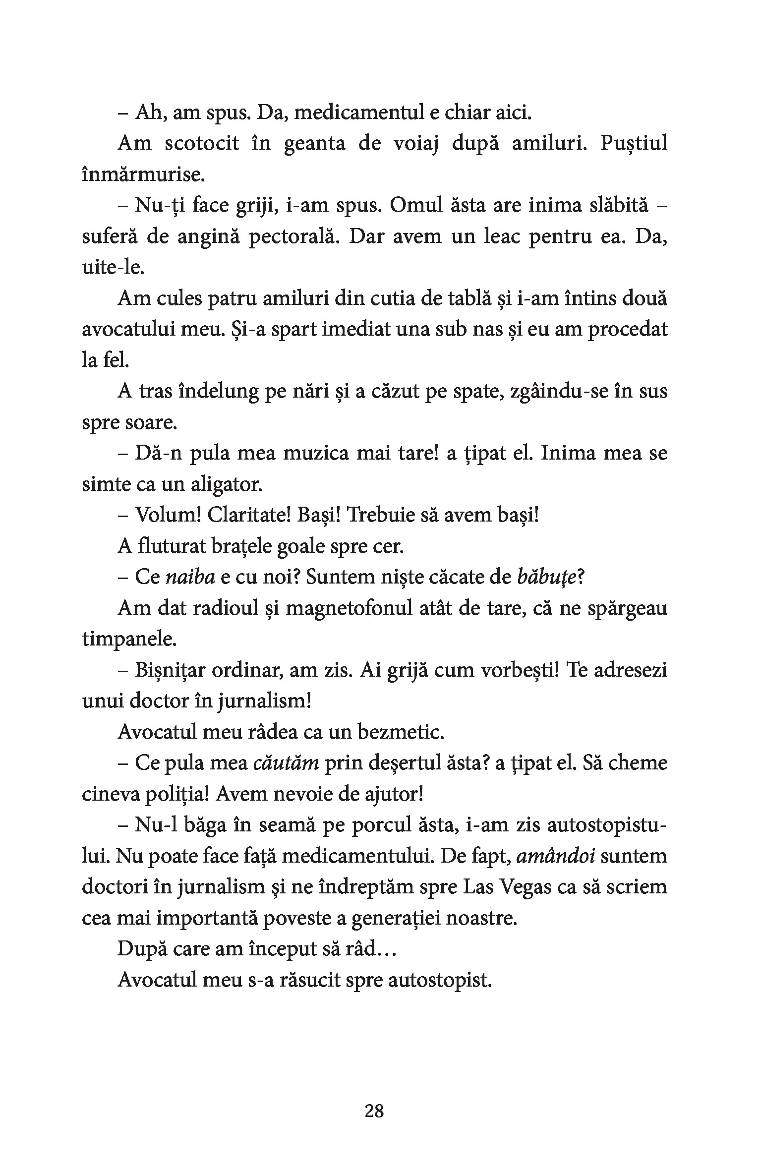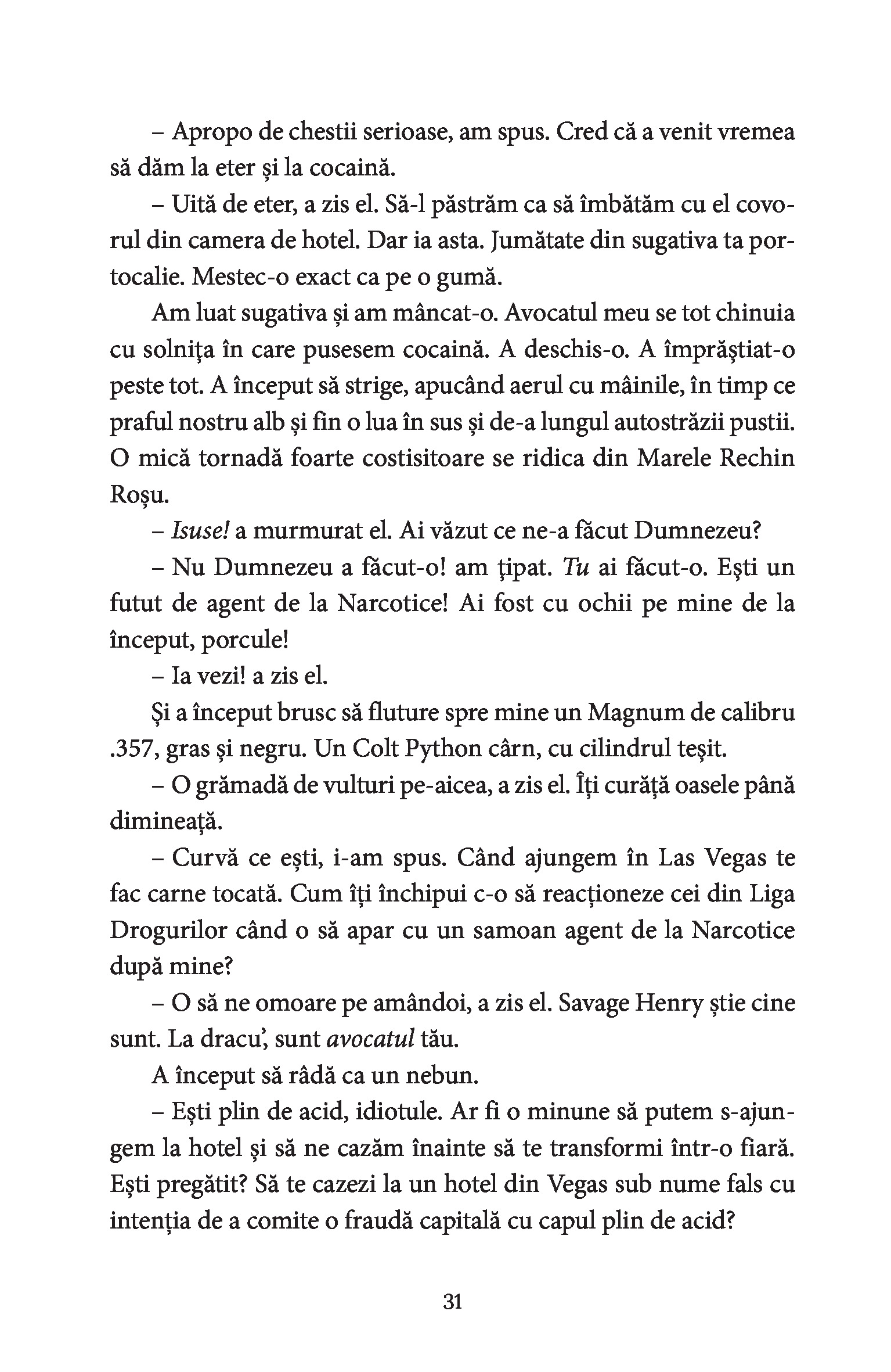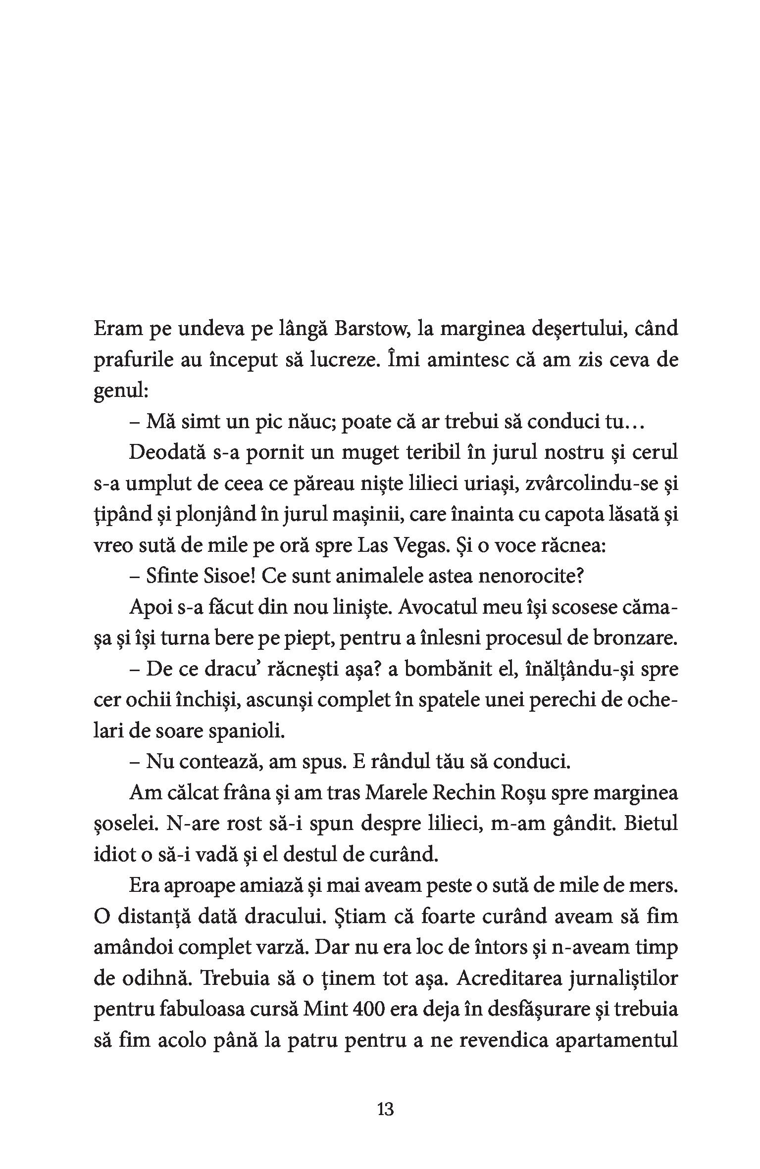 Să nu uităm că Hunter S. Thompson e scriitorul pentru al cărui stil hiperbolizant-parodic a trebuit să se inventeze un termen: Gonzo. Nu e o insultă, e un elogiu – pentru unul dintre cei mai originali producători de satiră ai postmodernității americane. Nu întâmplător, autorul își anunță „filosofia“ în linia marilor moraliști americani și alege pentru motto un citat din Samuel Johnson: „Cel ce se poartă ca un ticălos scapă de suferința de a fi om.“