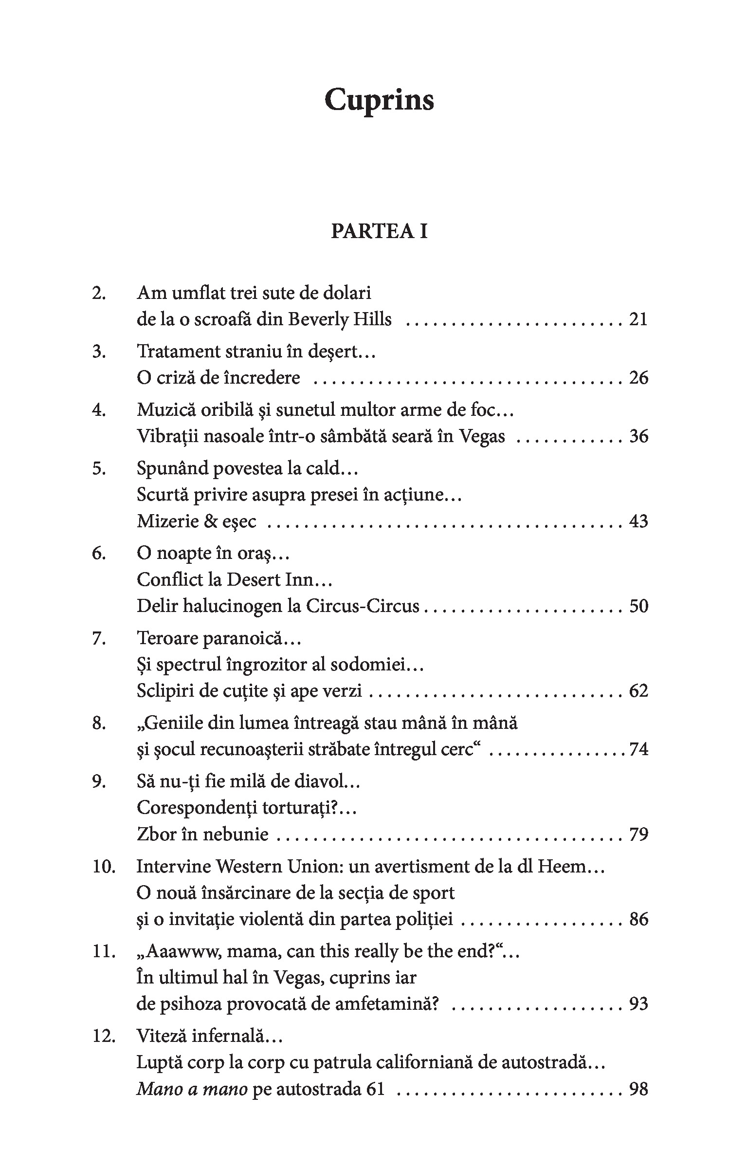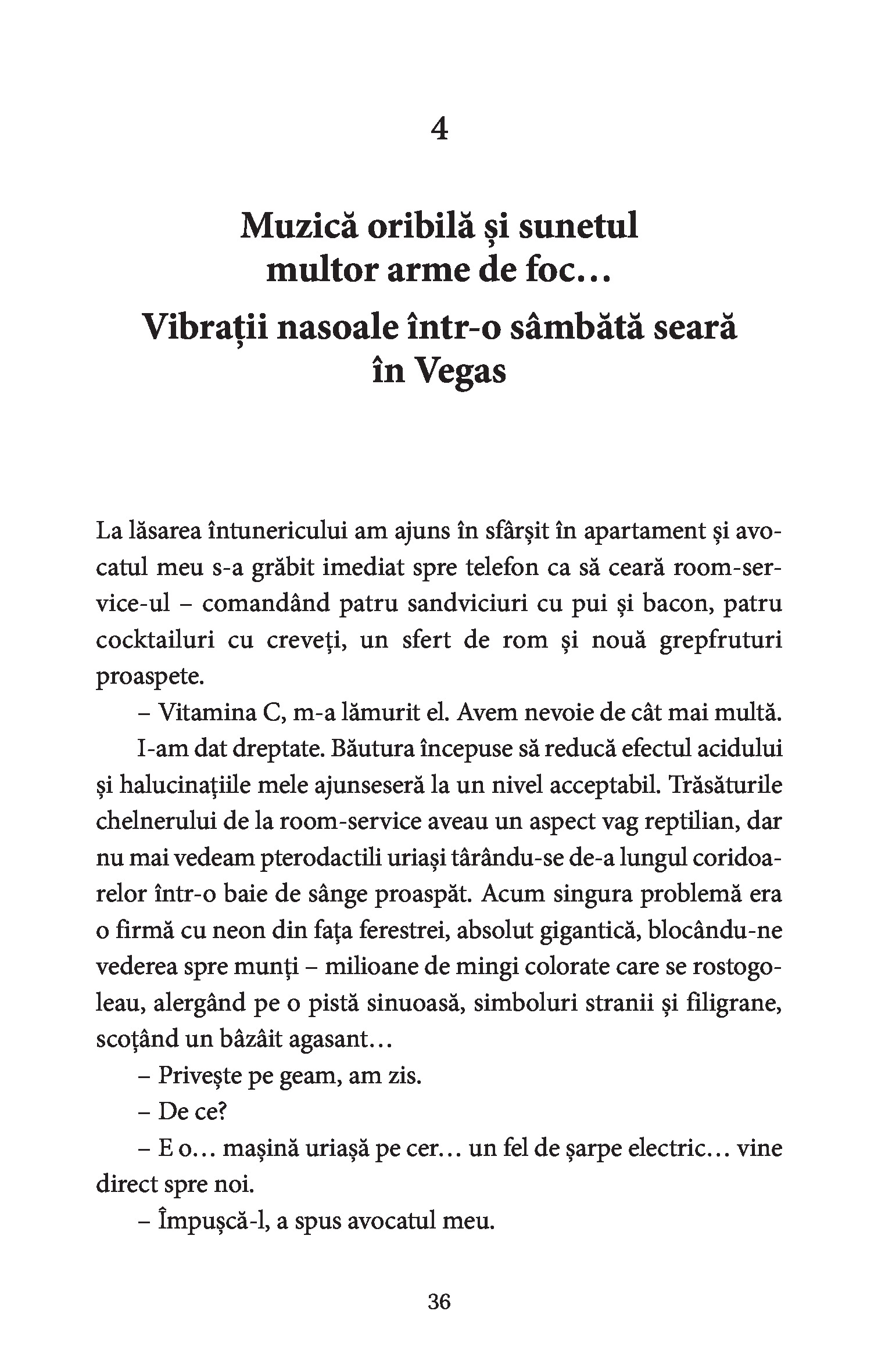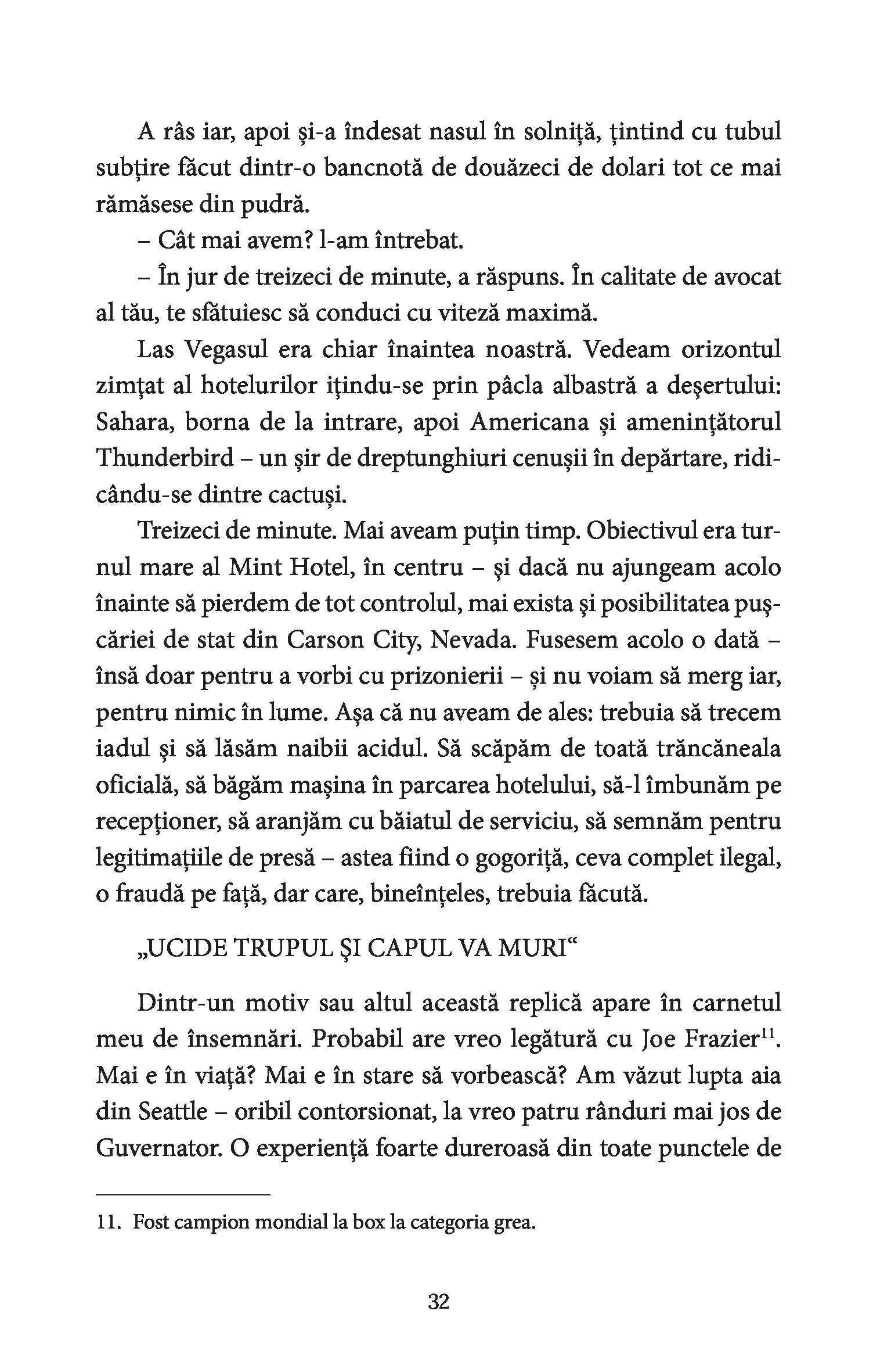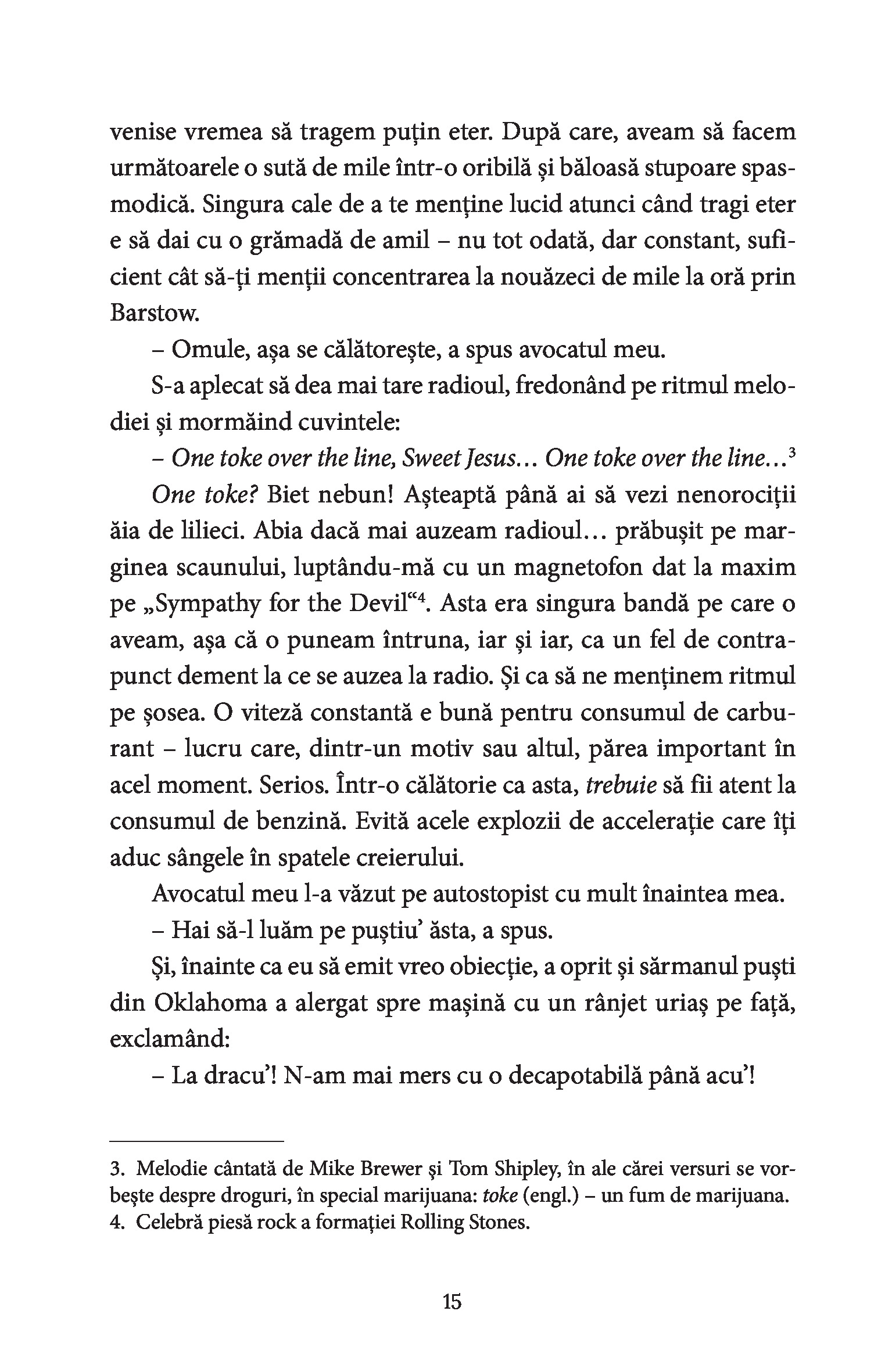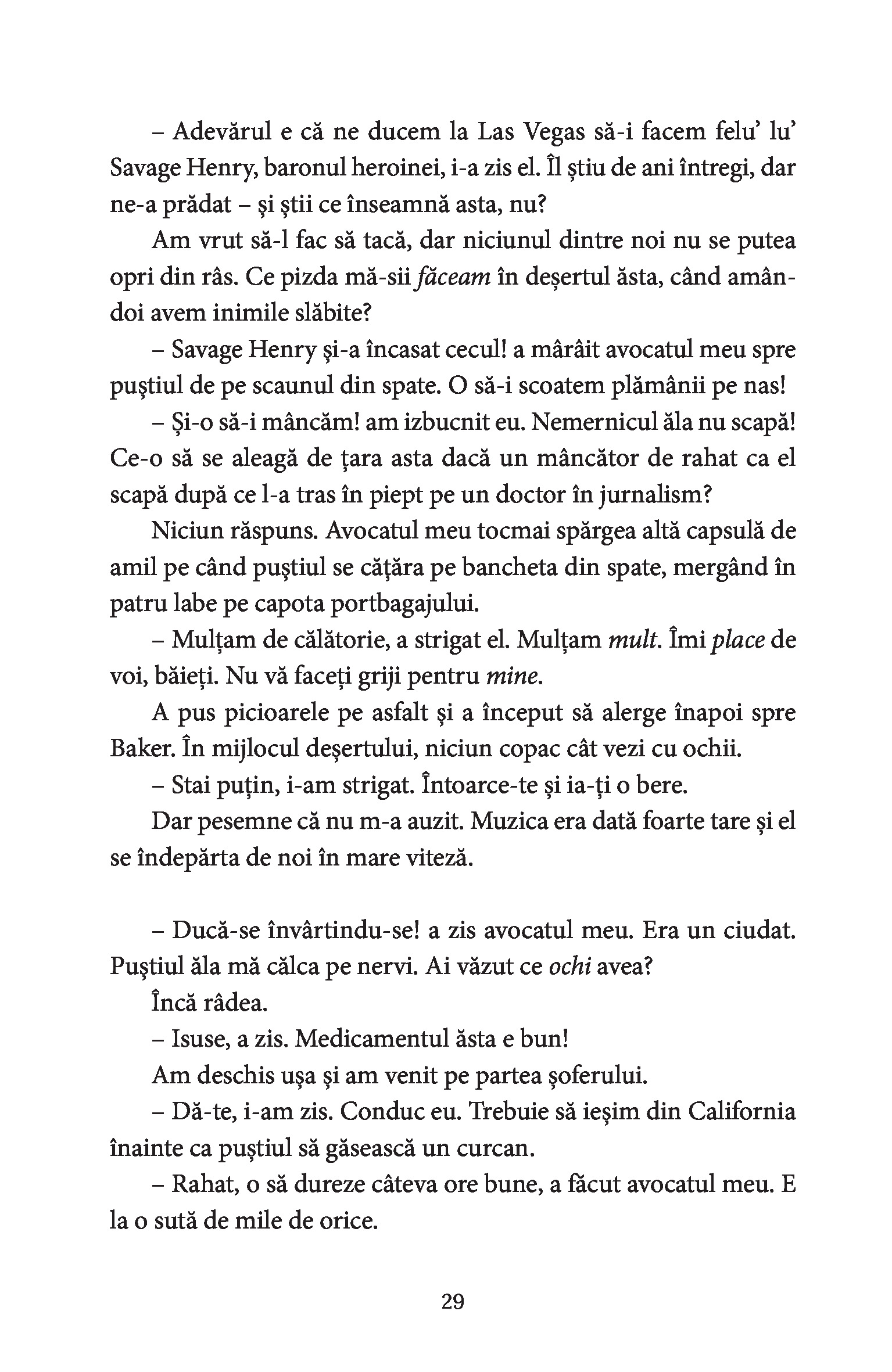 Să nu uităm că Hunter S. Thompson e scriitorul pentru al cărui stil hiperbolizant-parodic a trebuit să se inventeze un termen: Gonzo. Nu e o insultă, e un elogiu – pentru unul dintre cei mai originali producători de satiră ai postmodernității americane. Nu întâmplător, autorul își anunță „filosofia“ în linia marilor moraliști americani și alege pentru motto un citat din Samuel Johnson: „Cel ce se poartă ca un ticălos scapă de suferința de a fi om.“