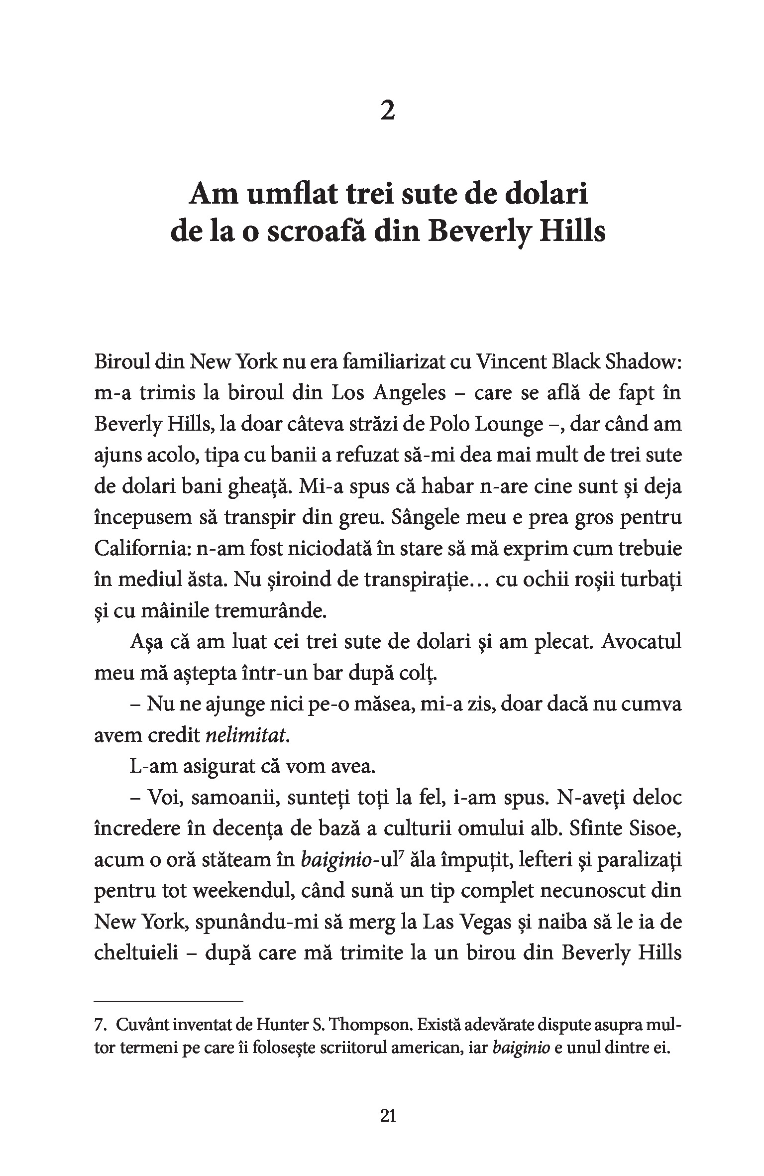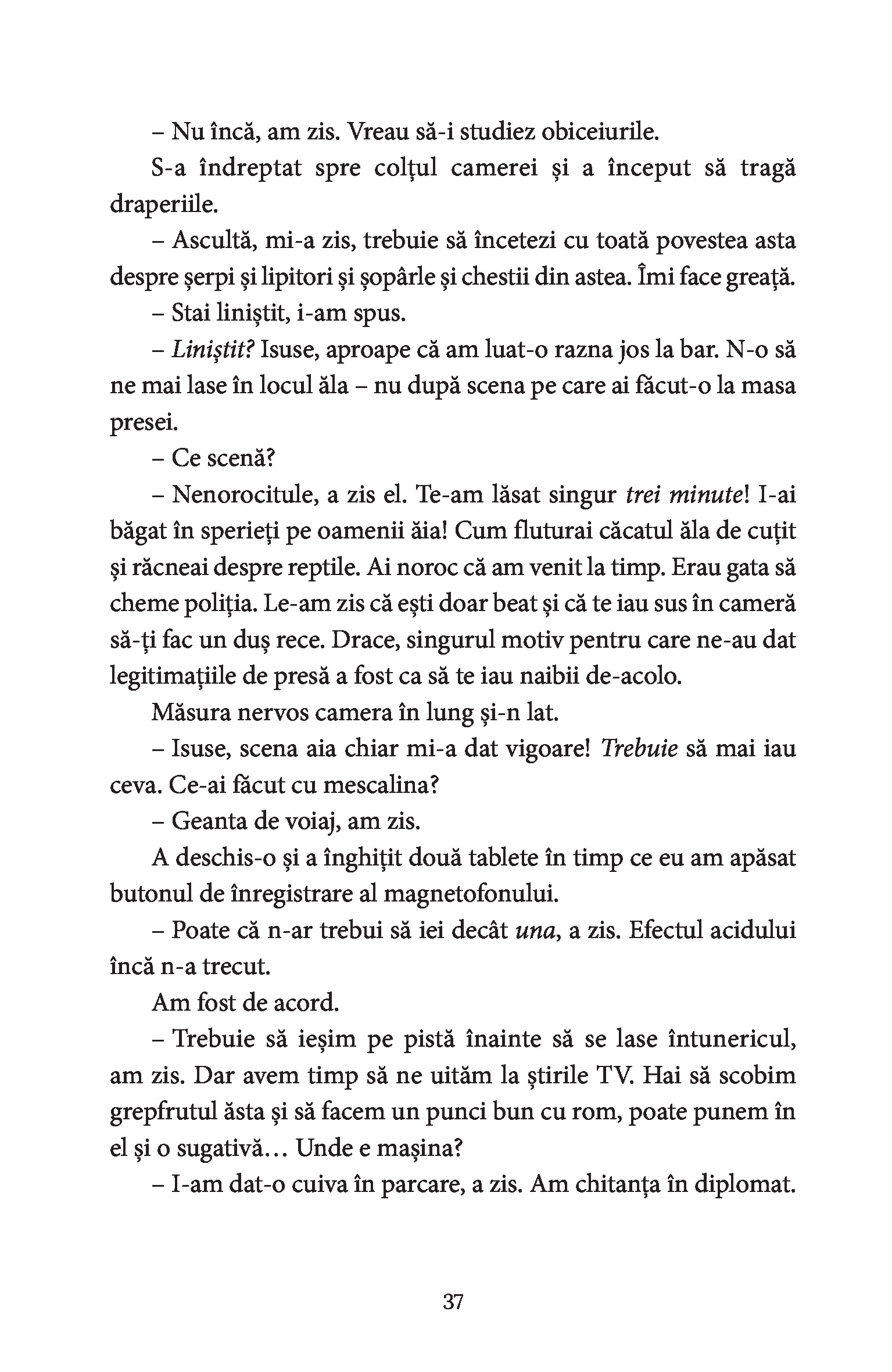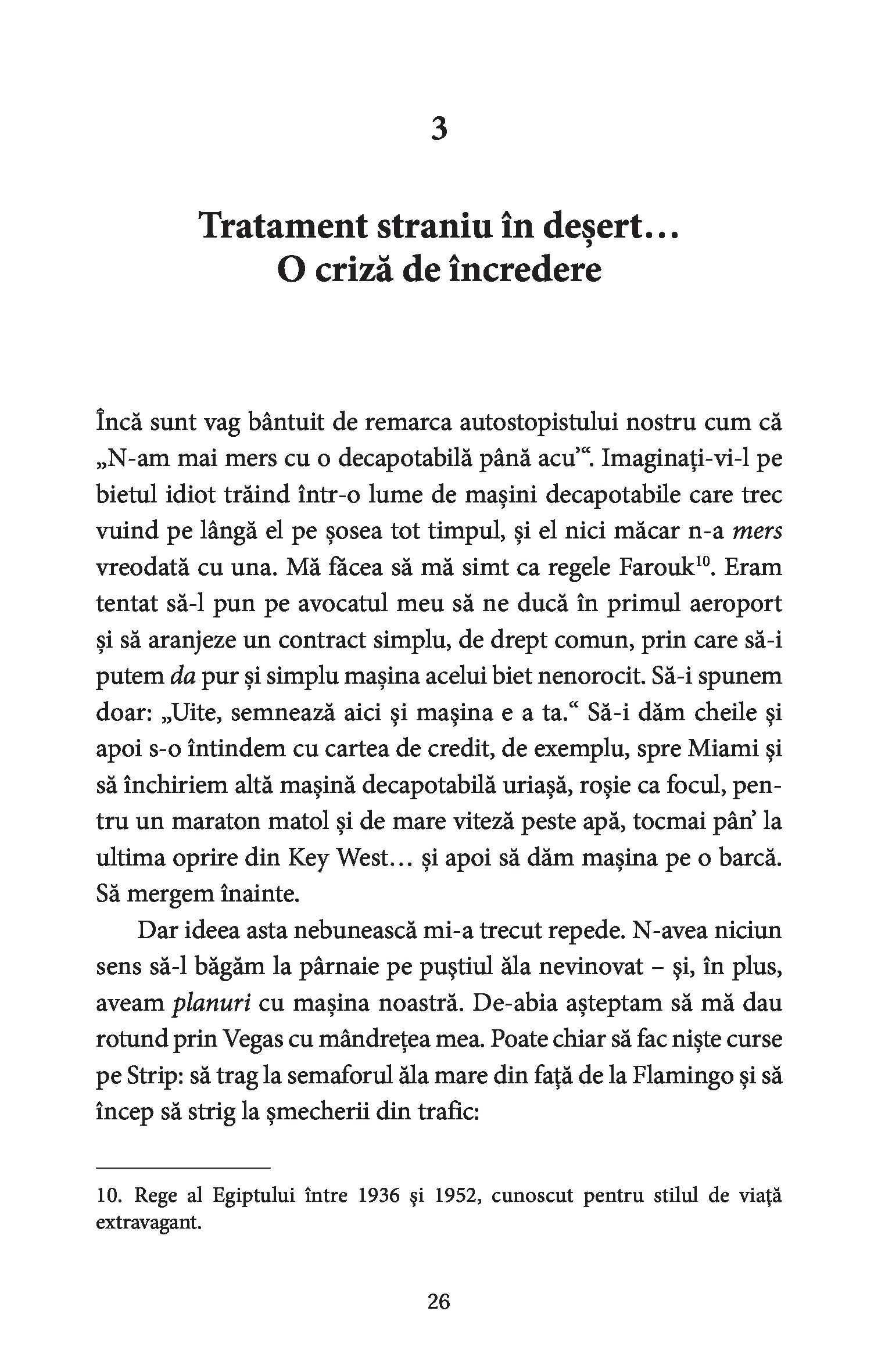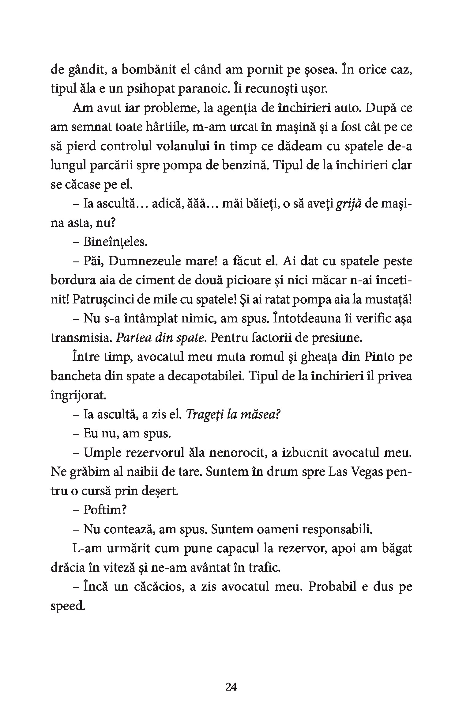 Să nu uităm că Hunter S. Thompson e scriitorul pentru al cărui stil hiperbolizant-parodic a trebuit să se inventeze un termen: Gonzo. Nu e o insultă, e un elogiu – pentru unul dintre cei mai originali producători de satiră ai postmodernității americane. Nu întâmplător, autorul își anunță „filosofia“ în linia marilor moraliști americani și alege pentru motto un citat din Samuel Johnson: „Cel ce se poartă ca un ticălos scapă de suferința de a fi om.“