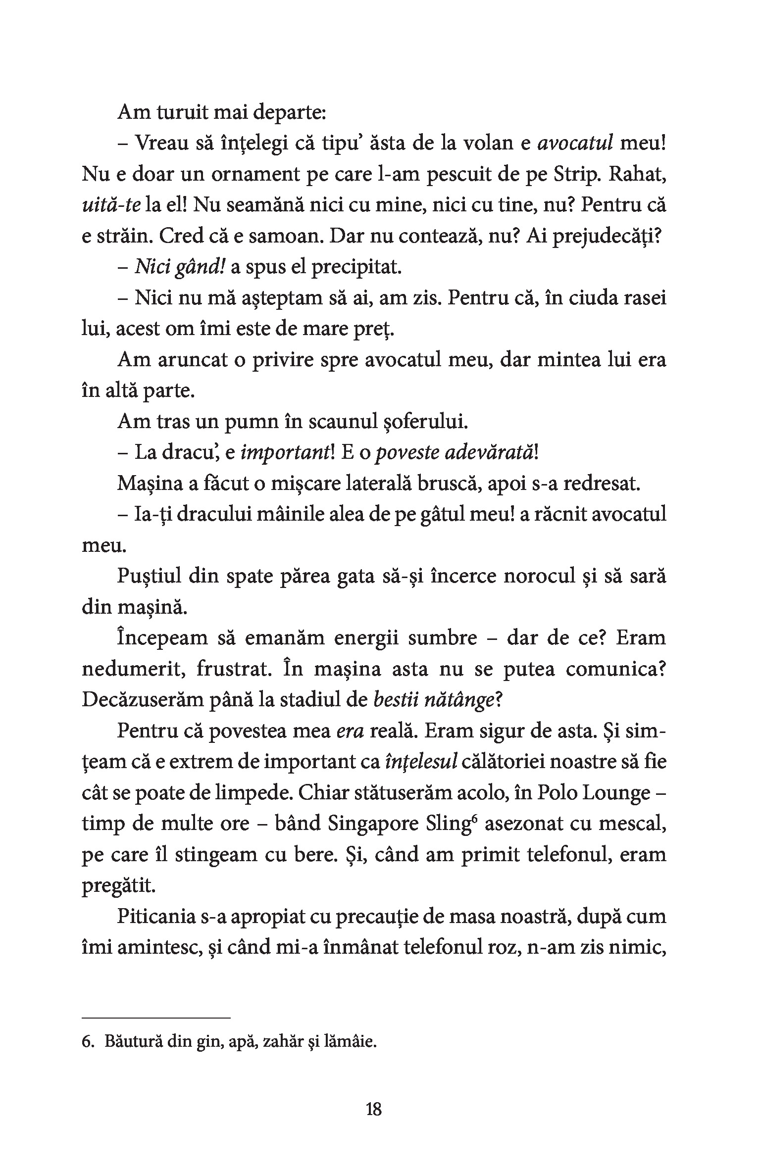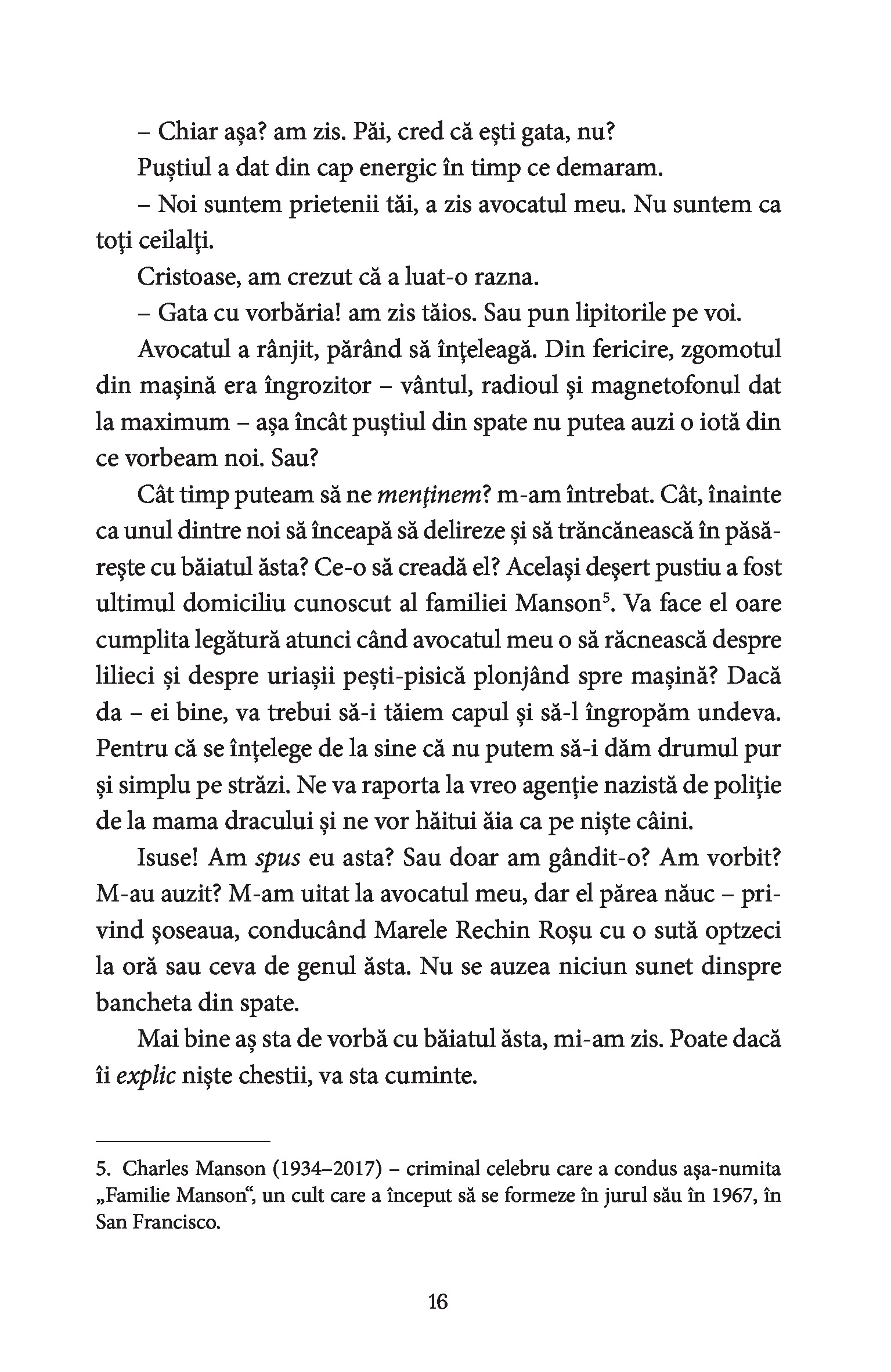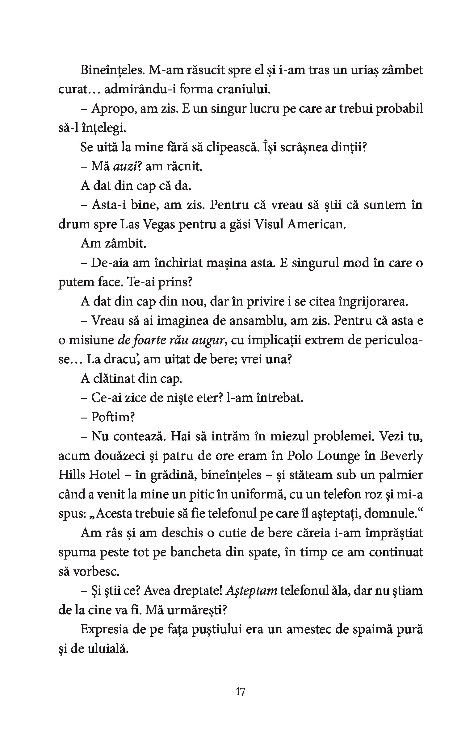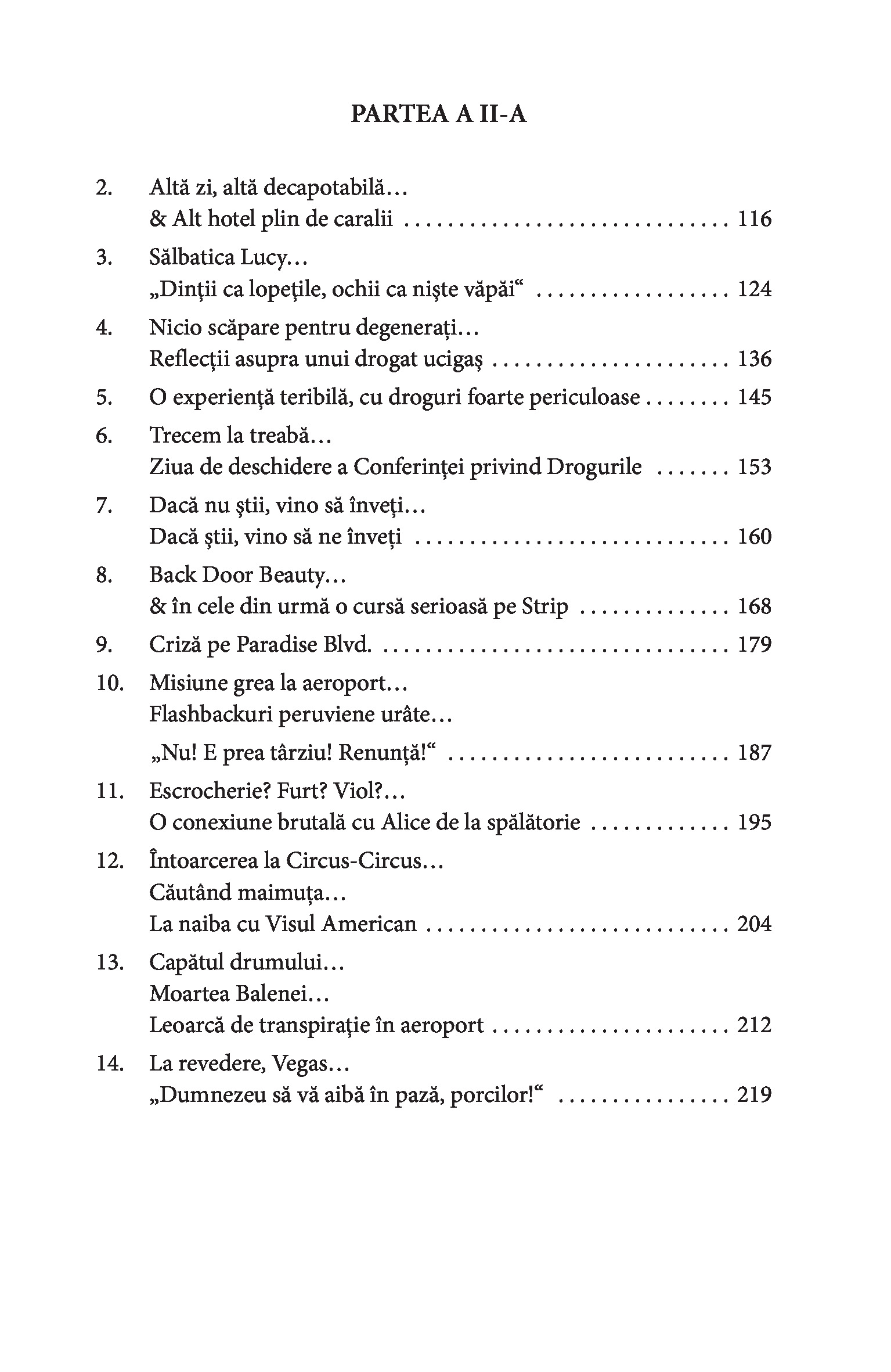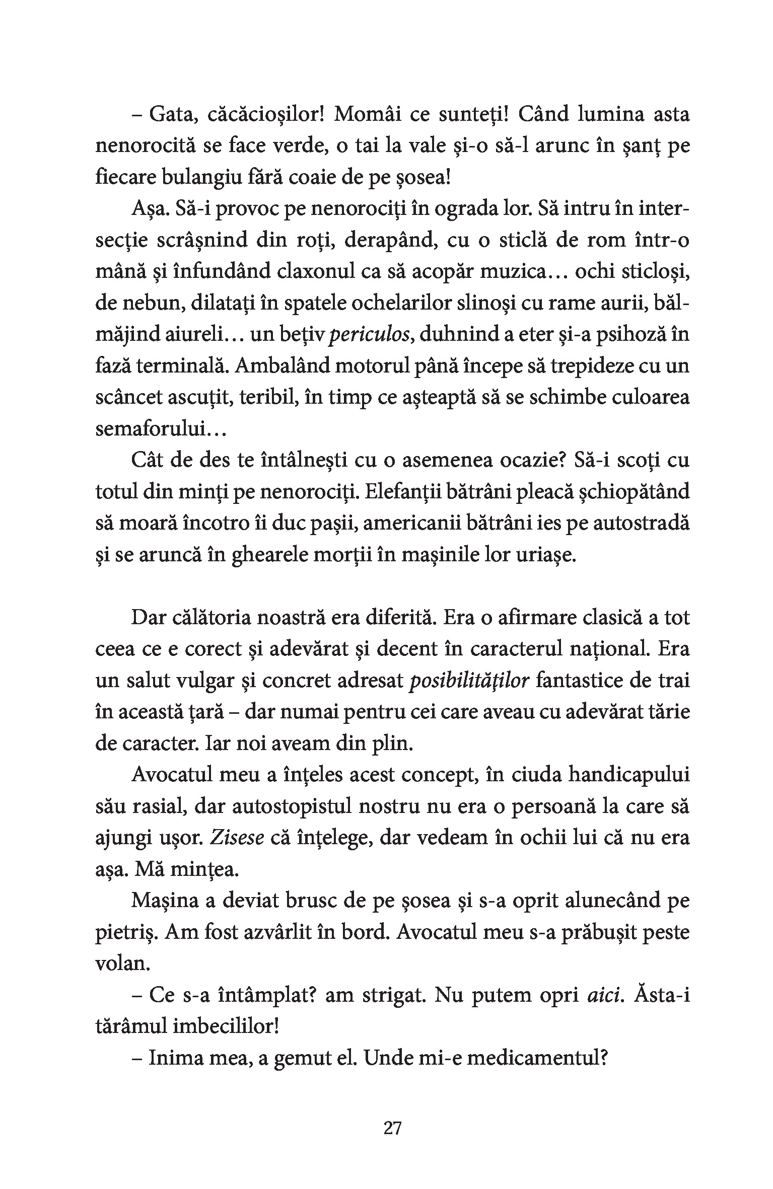 Să nu uităm că Hunter S. Thompson e scriitorul pentru al cărui stil hiperbolizant-parodic a trebuit să se inventeze un termen: Gonzo. Nu e o insultă, e un elogiu – pentru unul dintre cei mai originali producători de satiră ai postmodernității americane. Nu întâmplător, autorul își anunță „filosofia“ în linia marilor moraliști americani și alege pentru motto un citat din Samuel Johnson: „Cel ce se poartă ca un ticălos scapă de suferința de a fi om.“