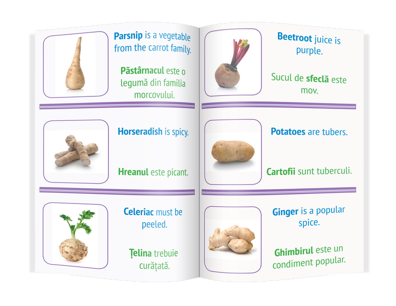 Bingoletto. Fructe și legume reprezintă un sistem inedit de a învăța limba engleză, inspirat de popularul joc de bingo. Cu ajutorul acestei metode, copilul va învăța cu ușurință denumirile unor fructe și legume, îmbogățindu-și astfel vocabularul.