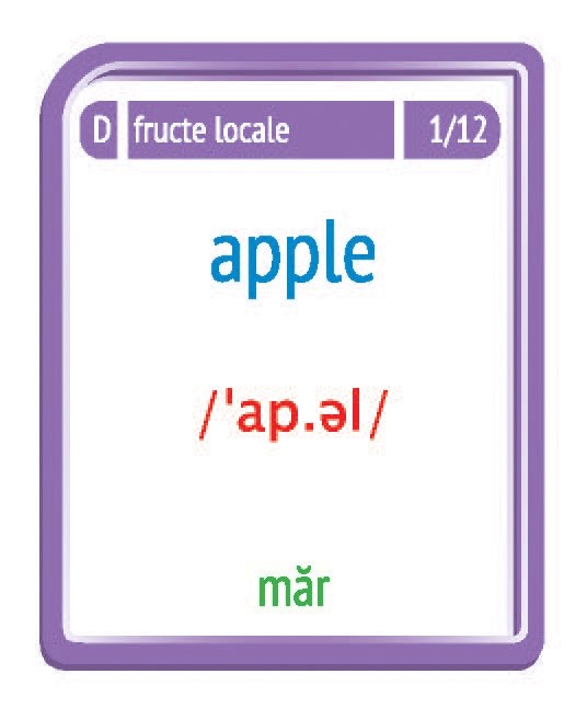 • 56 de carduri cu control al poziției. Fiecare card conține pe o față imaginea, iar pe verso cuvântul din limba engleză corespunzător, însoțit de traducere și transcriere fonetică;