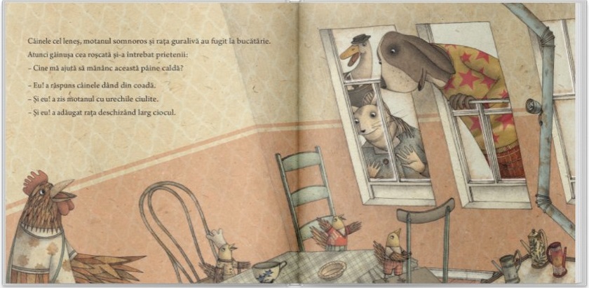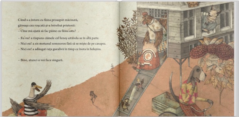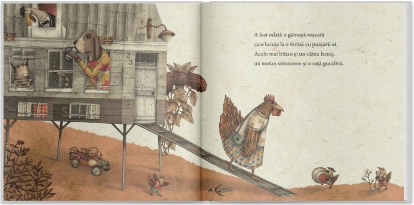 Puse în pagină în straie noi, fabulele moderne prezintă subiecte moralizatoare deja consacrate în istoria omenirii. Aceleași defecte sunt trase la răspundere, în timp ce personajele necuvântătoare – flori, păsări sau animale – devin portavocea unor replici traduse în limbaj contemporan, formulate parcă pe-nțelesul ascultătorilor de-acum, în aceeași speranță de îndreptare. De-această dată, morala se vrea a fi desprinsă și însușită din cartea „Găinușa cea roșcată”, poveste adaptată de Pilar Martinez, pornind de la un basm popular, și ilustrată de Marco Somà.