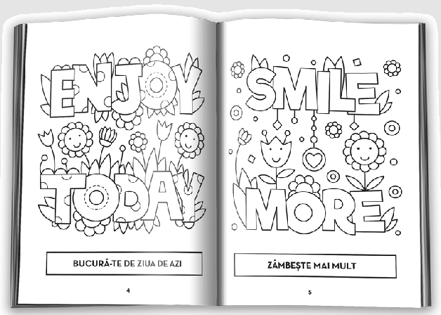 Colecția de cărți de colorat Gândește pozitiv se adresează tuturor celor care vor să se relaxeze și să-și antreneze mintea să adopte o gândire pozitivă. Fiecare pagină de colorat conține și o afirmație pozitivă în limba engleză, care explorează concepte precum fericirea, iubirea, încrederea în sine, bunătatea, prietenia etc. Colorarea este deja o activitate relaxantă, iar expunerea la aceste mesaje pozitive întărește starea de bine și stima de sine.