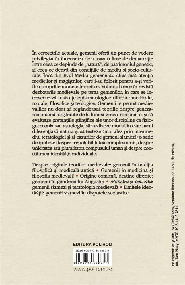 În cercetările actuale, gemenii oferă un punct de vedere privilegiat în încercarea de a trasa o linie de demarcaţie între ceea ce depinde de „natură”, de patrimoniul genetic, şi ceea ce derivă din condiţiile de mediu şi socioculturale. Încă din Evul Mediu gemenii au atras însă atenţia medicilor şi magiştrilor, care i-au folosit pentru a-şi verifica propriile modele teoretice. Volumul trece în revistă dezbaterile medievale pe tema gemenilor, în care se intersectează instanţe epistemologice diferite: medicale, morale, filosofice şi teologice. Gemenii le permit medievalilor nu doar să regîndească teoriile despre generarea umană moştenite de la lumea greco-romană, ci și să evalueze pretenţiile ştiinţifice ale unor discipline ca fiziognomonia sau astrologia, să analizeze modul în care harul diferențiază natura și să testeze (mai ales prin intermediul teratologiei şi al cazurilor de gemeni siamezi) o serie de ipoteze despre irepetabilitatea complexiunii, despre unicitatea sau pluralitatea compusului uman şi despre constituirea identităţii individuale.