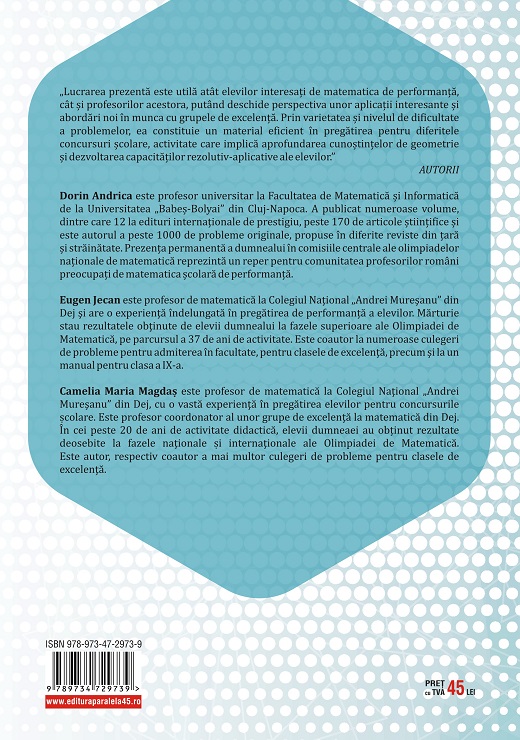 „Lucrarea prezentă este utilă atât elevilor interesați de matematica de performanță, cât și profesorilor acestora, putând deschide perspectiva unor aplicații interesante și abordări noi în munca cu grupele de excelență. Prin varietatea și nivelul de dificultate a problemelor, ea constituie un material eficient în pregătirea pentru diferitele concursuri școlare, activitate care implică aprofundarea cunoștințelor de geometrie și dezvoltarea capacităților rezolutiv-aplicative ale elevilor.”