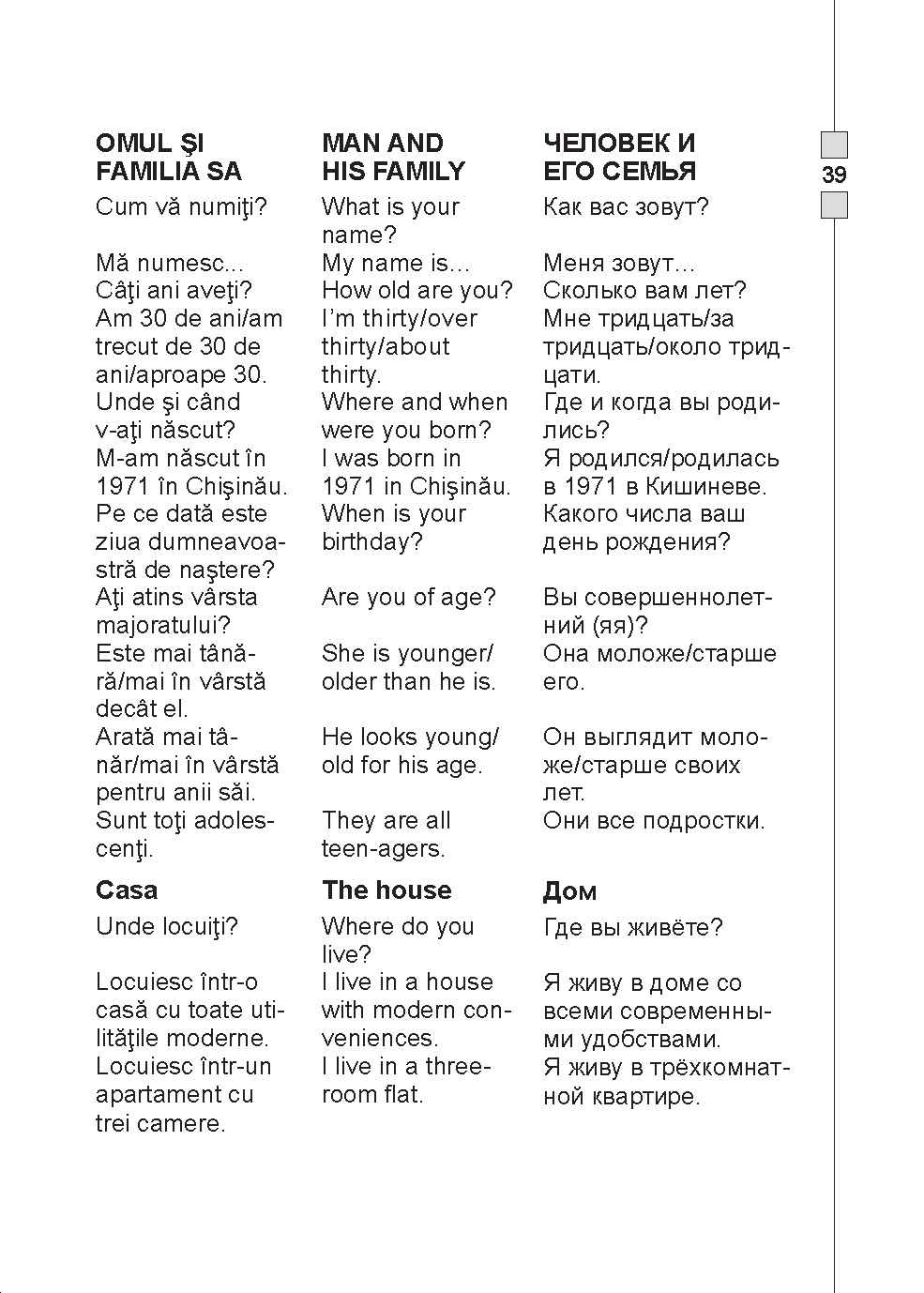 Ghidurile propun expresii uzuale şi situaţii de comunicare din viaţa cotidiană. Sunt prezentate astfel de teme ca Familia, Învăţământul, Sportul, Distracţiile, Serviciile publice, Călătoriile, Economia, Sănătatea, Portretul fizic şi moral etc. Ele sunt destinate elevilor şi studenţilor, în particular, şi tuturor celor care doresc să comunice în una din limbile respective, în general. Ghidurile cuprind o serie de întrebări şi răspunsuri adecvate situaţiilor de comunicare: În oraş, În stradă, La magazin, La gară, În muzeu, La cinema… Rubrica Verbul în expresii şi Tabelul de conjugare a unor verbe neregulate vin să completeze cunoştinţele în materie de comunicare.