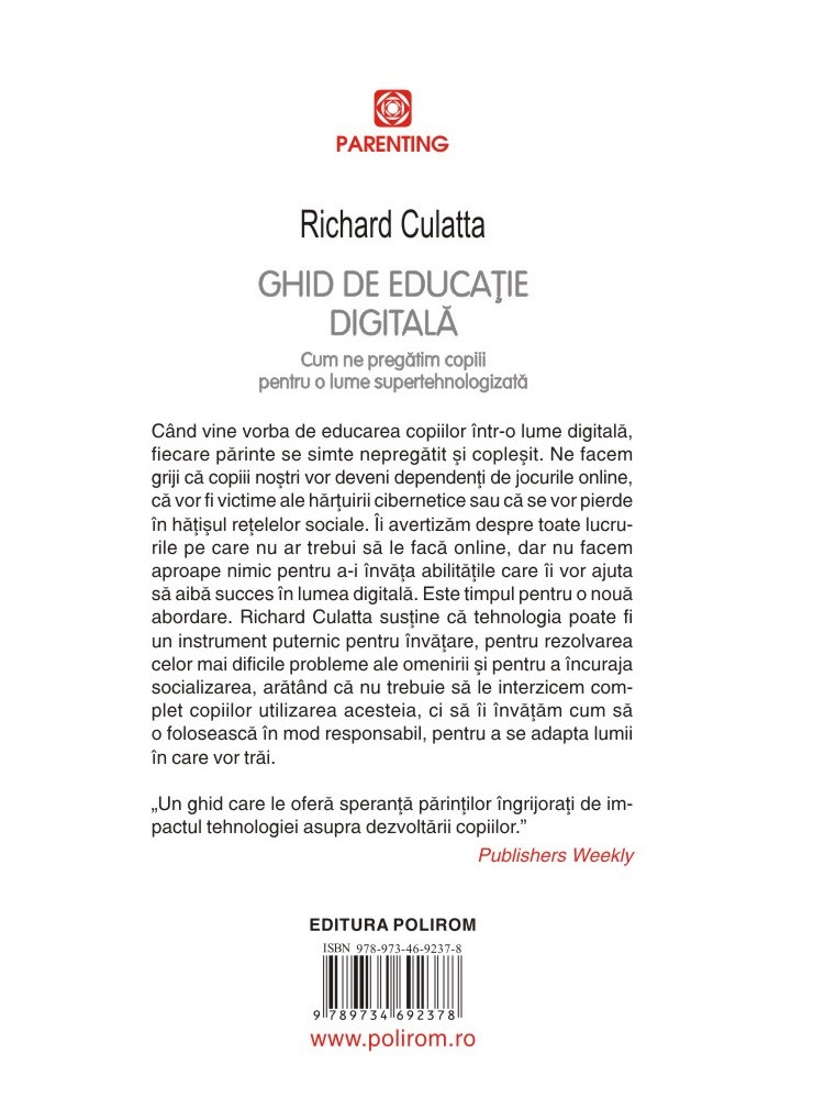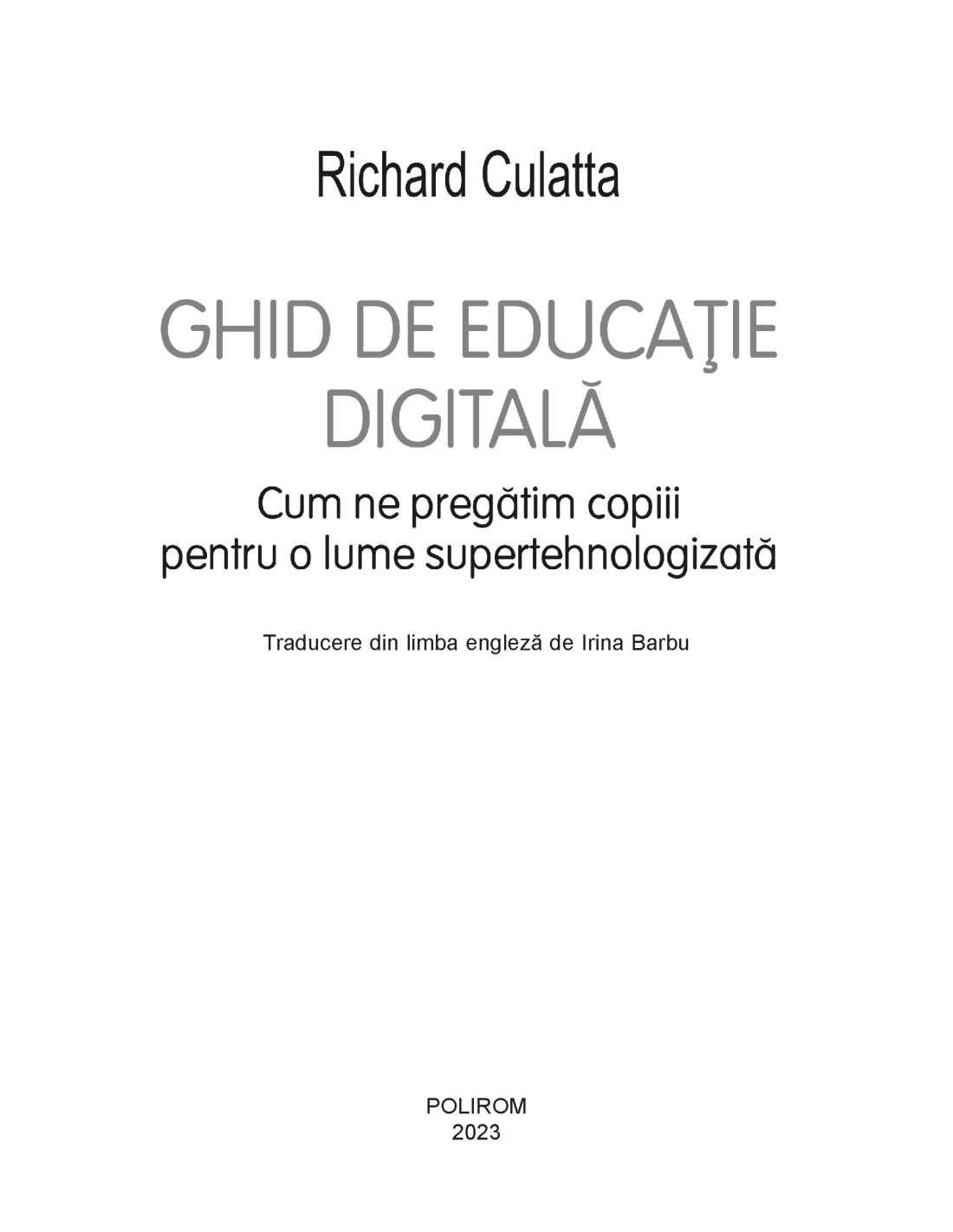 Când vine vorba de educarea copiilor într-o lume digitală, fiecare părinte se simte nepregătit și copleșit. Ne facem griji că copiii noștri vor deveni dependenți de jocurile online, că vor fi victime ale hărțuirii cibernetice sau că se vor pierde în hățișul rețelelor sociale. Îi avertizăm despre toate lucrurile pe care nu ar trebui să le facă online, dar nu facem aproape nimic pentru a-i învăța abilitățile care îi vor ajuta să aibă succes în lumea digitală. Este timpul pentru o nouă abordare. Richard Culatta susține că tehnologia poate fi un instrument puternic pentru învățare, pentru rezolvarea celor mai dificile probleme ale omenirii și pentru a încuraja socializarea, arătând că nu trebuie să le interzicem complet copiilor utilizarea acesteia, ci să îi învățăm cum să o folosească în mod responsabil, pentru a se adapta lumii în care vor trăi.