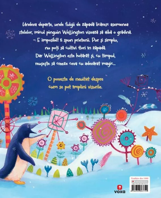 Undeva departe, unde fulgii de zăpadă licăresc asemenea stelelor, micul pinguin Wellington visează să aibă o grădină.
