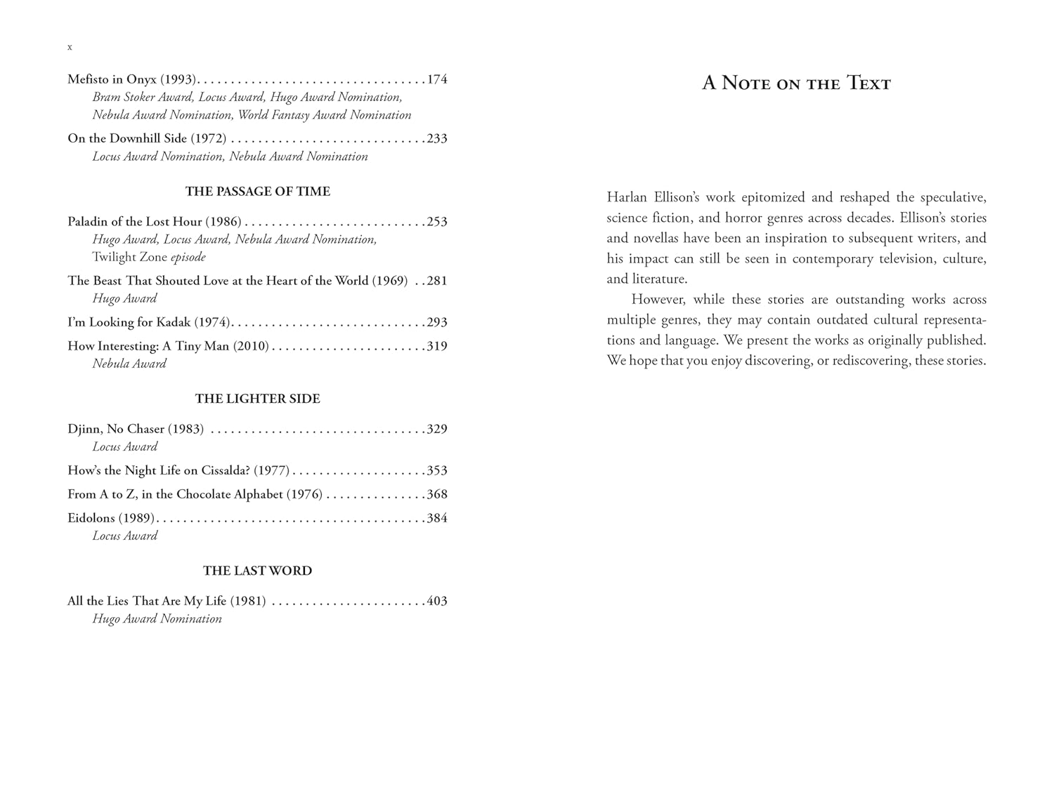 A collection of award-winning short stories by Harlan Ellison, an eight-time Hugo Award-winner, five-time Bram Stoker Award winner, and four-time Nebula Award winner.