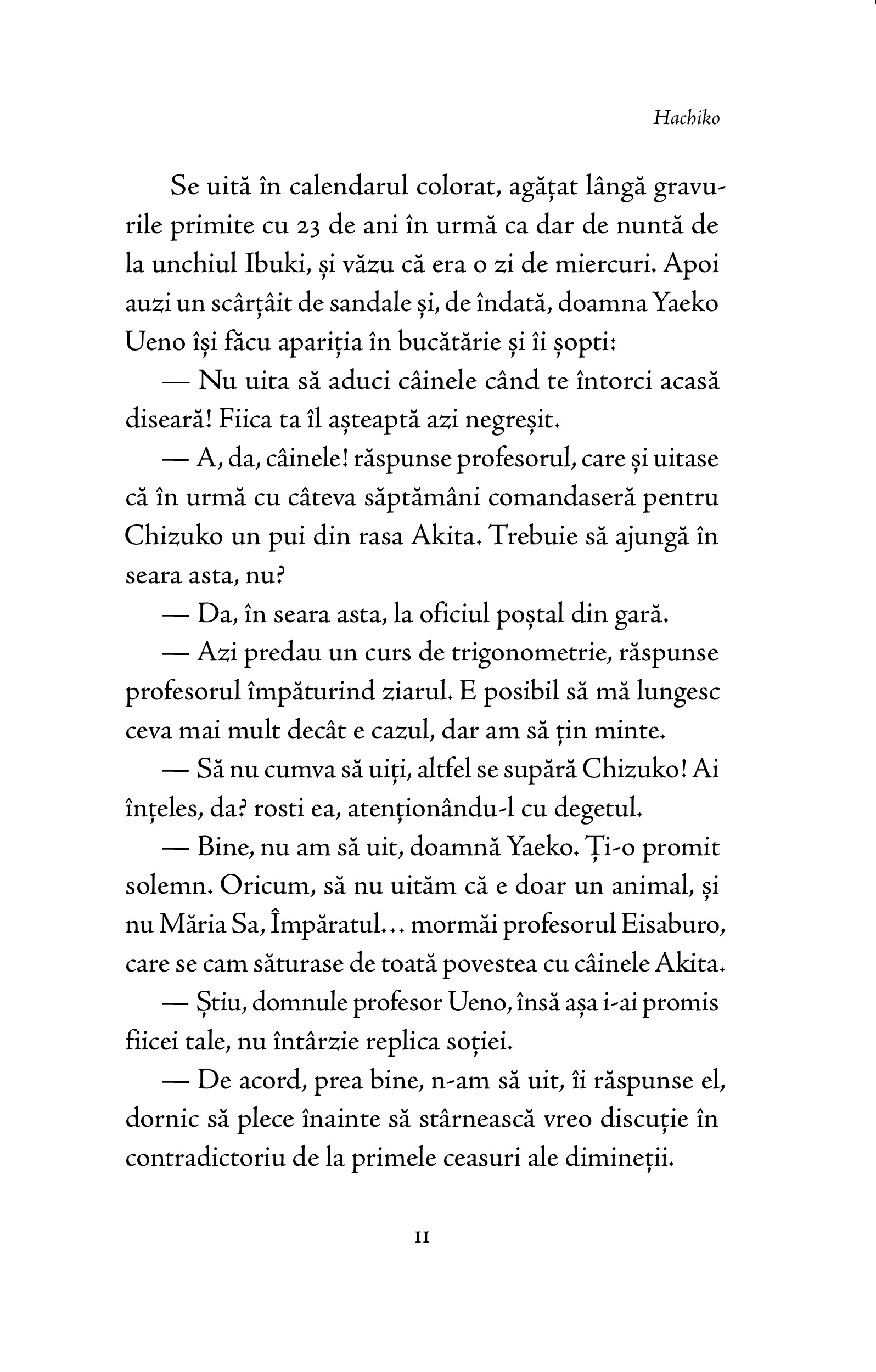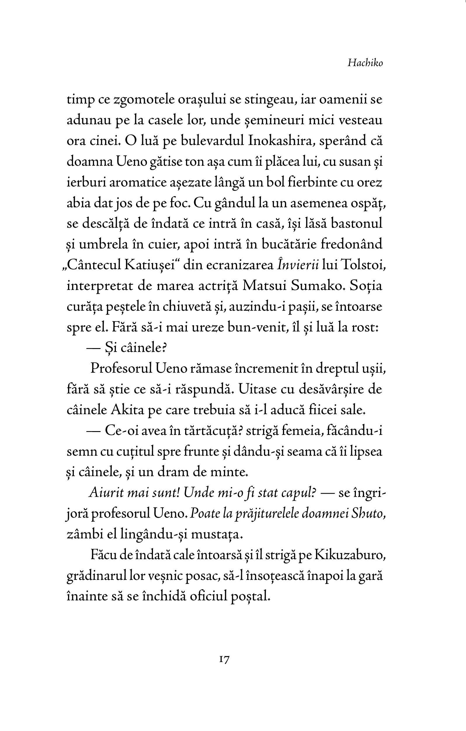 În fiecare dimineață Hachiko își însoțește stăpânul la gara și în fiecare după-amiaza îi a_teapta întoarcerea, la 17:30 _ x. Zi de zi, săptamână după săptămână, lună de lună, an dupa an...