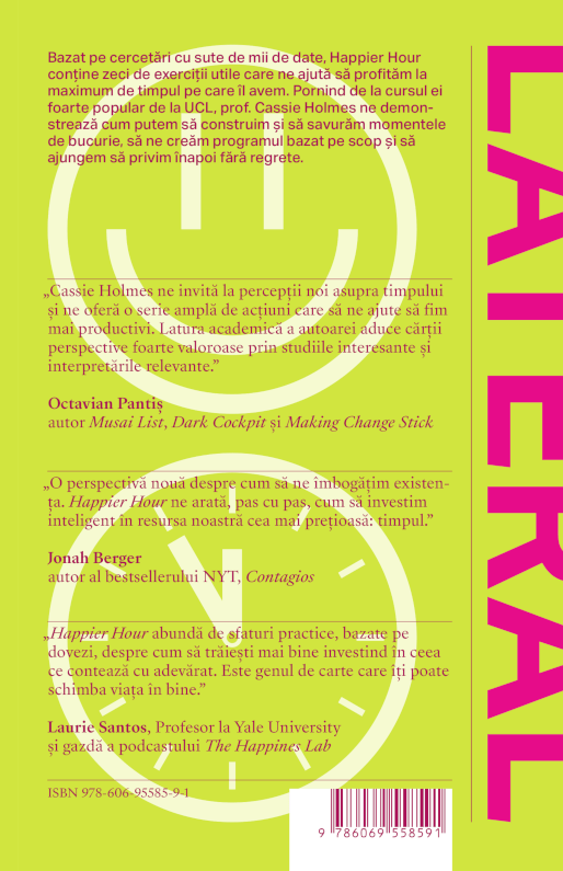 Pornind de la cursul ei foarte popular de la UCL, prof. Cassie Holmes ne demonstrează cum putem să construim și să savurăm momentele de bucurie, să ne creăm programul bazat pe scop și să ajungem să privim înapoi fără regrete.