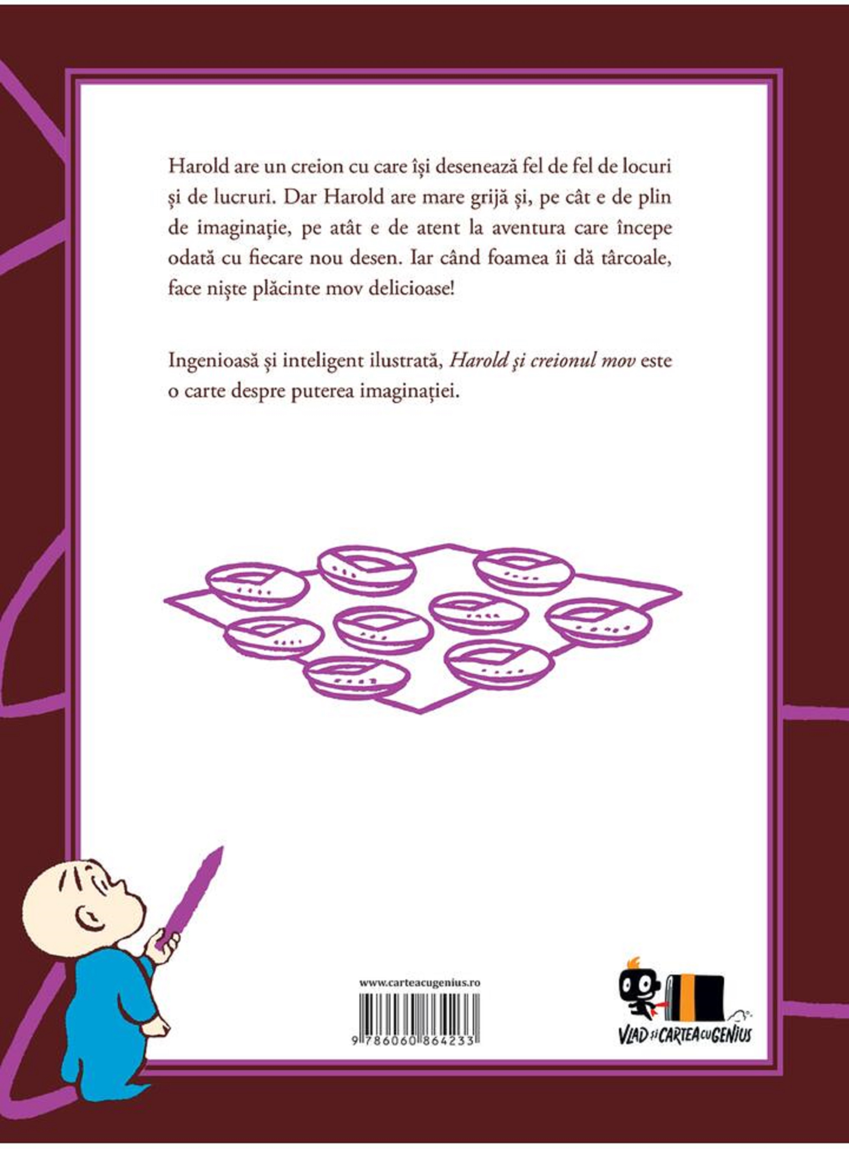 Harold are un creion cu care îşi desenează fel de fel de locuri şi de lucruri. Dar Harold are mare grijă şi, pe cât e de plin de imaginaţie, pe atât e de atent la aventura care începe odată cu fiecare nou desen. Iar când foamea îi dă târcoale, face nişte plăcinte mov delicioase!