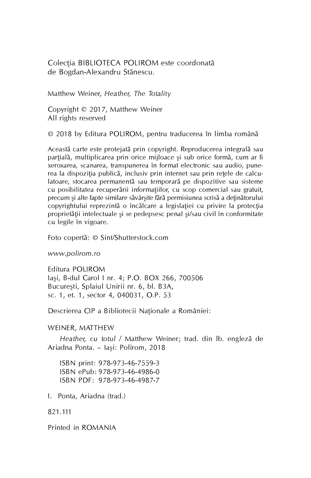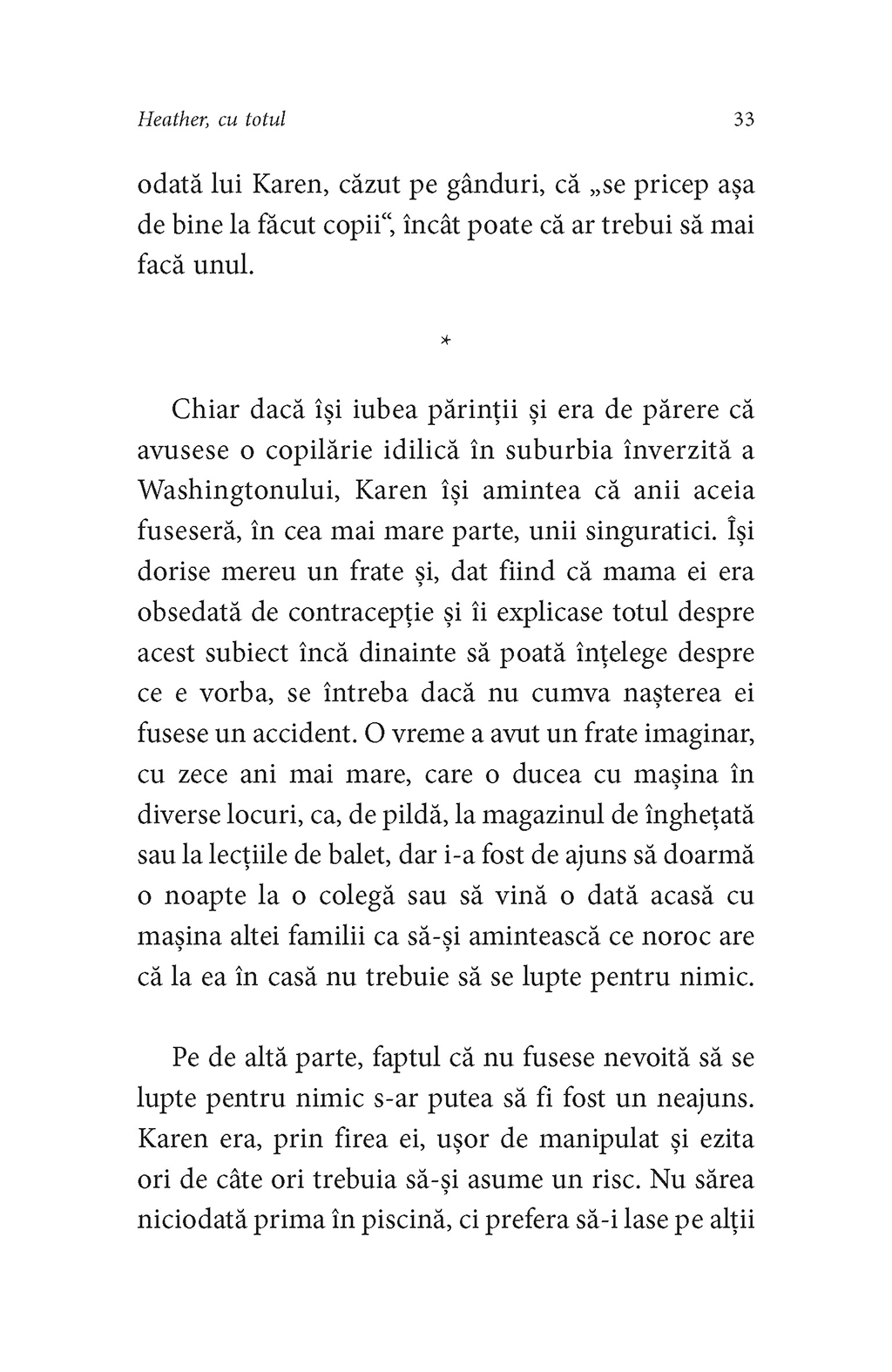 Mark şi Karen Breakstone formează un cuplu tipic din clasa înstărită newyorkeză. Cei doi duc o viaţă liniştită, prosperă şi destul de ternă pînă în momentul cînd li se naşte unicul copil, Heather, o fată de o frumuseţe şi o inteligenţă ieşite din comun. La vîrsta adolescenţei, Heather ajunge să vadă fragilitatea şi superficialitatea legăturii dintre părinţii ei. În acelaşi timp, într-un orăşel din New Jersey se naşte şi creşte Bobby Klasky, fiul unei mame dependente de droguri şi al unui tată necunoscut. Crescut printre sticle de băutură, droguri şi scrumiere pline de chiştoace, Bobby pare sortit unei vieţi sordide, în ghetou sau chiar în puşcărie. Nici el, nici Heather nu au habar că destinele lor se vor intersecta. Scris cu mînă sigură, Heather, cu totul ilustrează cu o remarcabilă economie de mijloace o realitate contemporană sumbră, concentrată într-o poveste cu puţine personaje şi multă forţă emoţională, al cărei final are o puternică încărcătură simbolică.