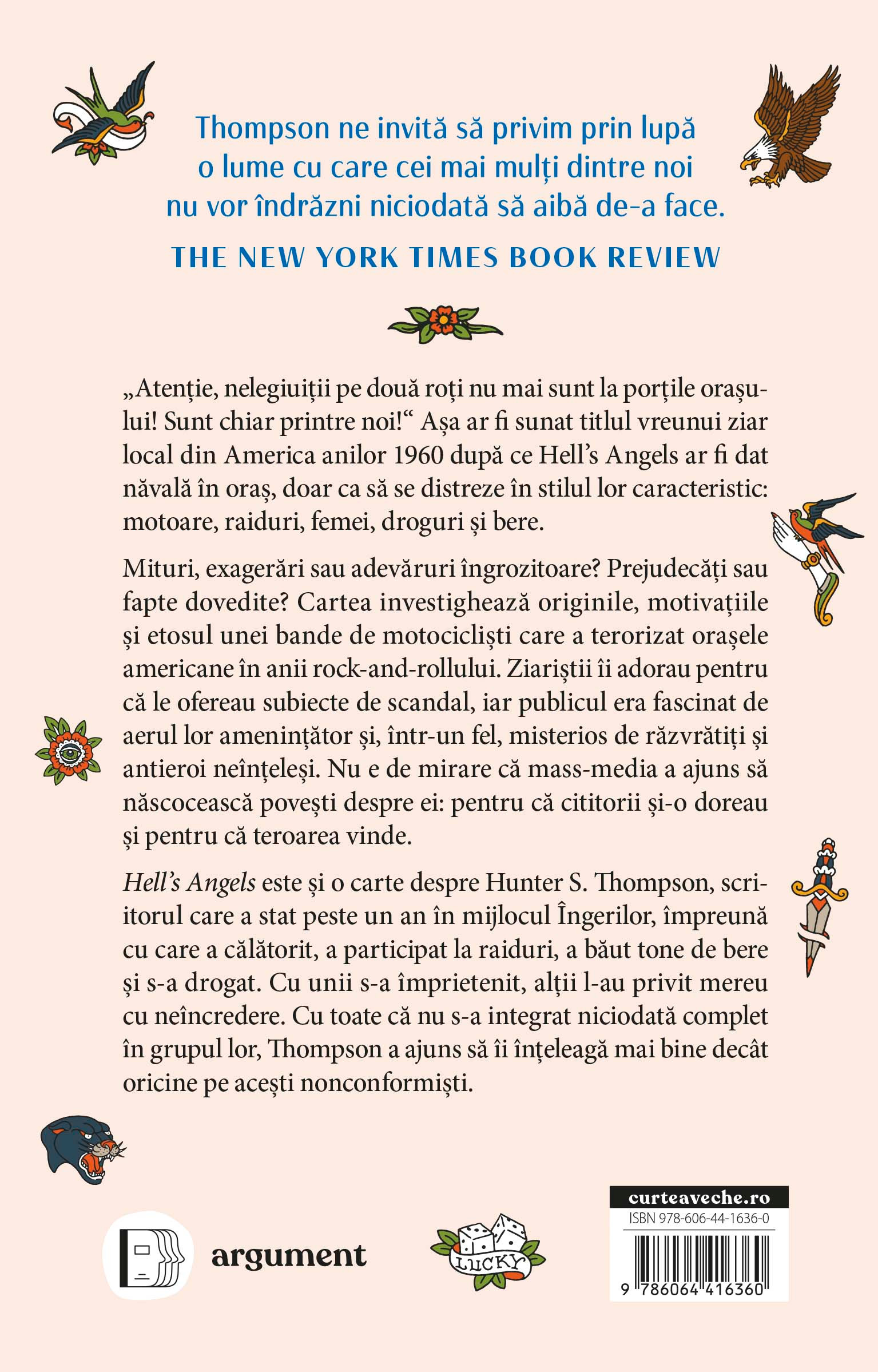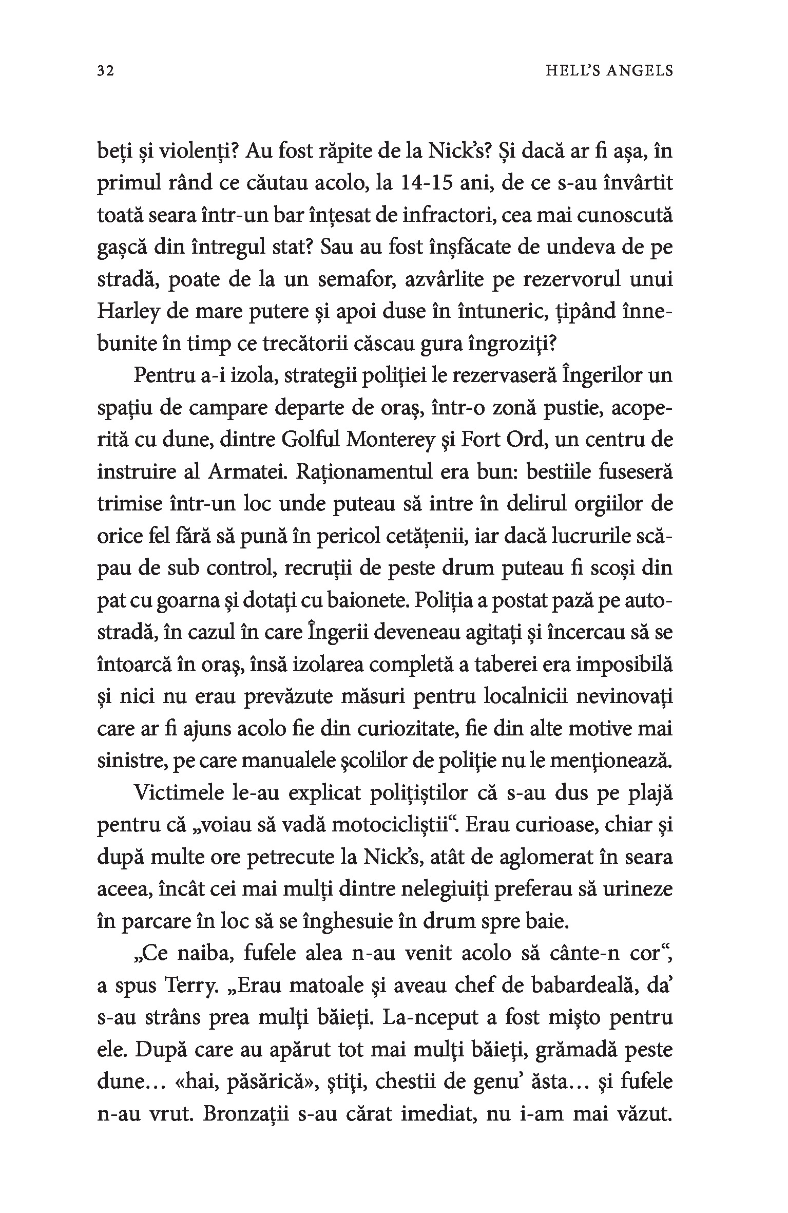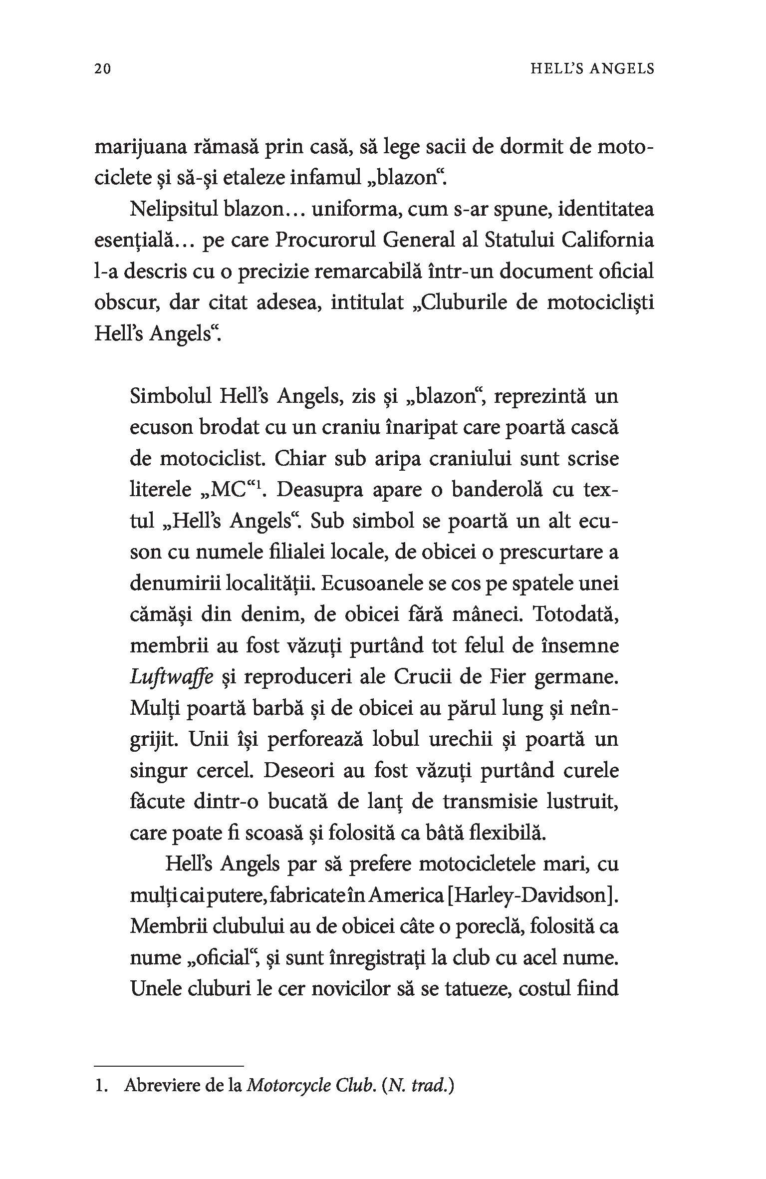 Hell’s Angels este și o carte despre Hunter S. Thompson, scriitorul care a stat peste un an în mijlocul Îngerilor, împreună cu care a călătorit, a participat la raiduri, a băut tone de bere și s-a drogat. Cu unii s-a împrietenit, alții l-au privit mereu cu neîncredere. Cu toate că nu s-a integrat niciodată complet în grupul lor, Thompson a ajuns să îi înțeleagă mai bine decât oricine pe acești nonconformiști.