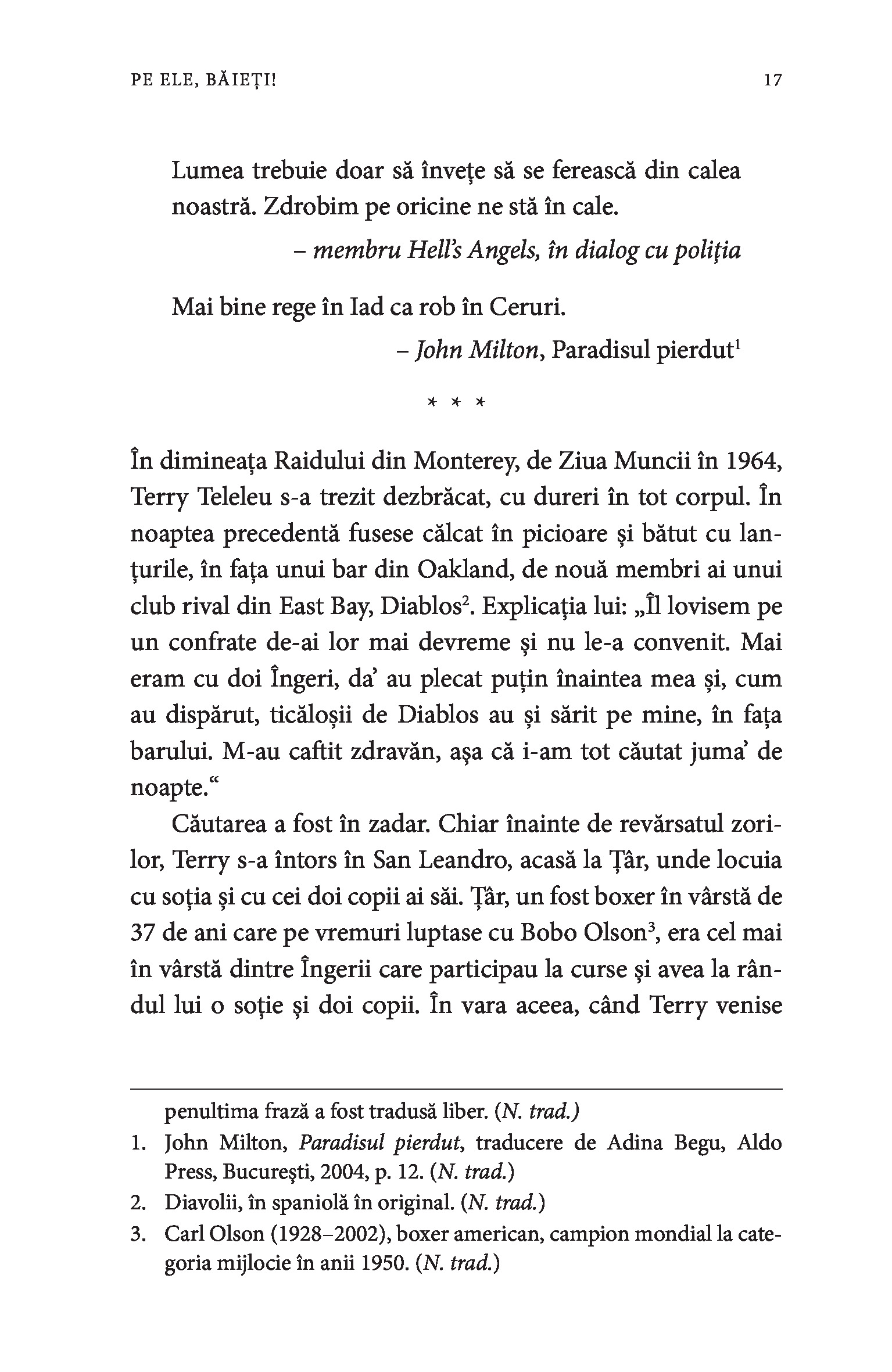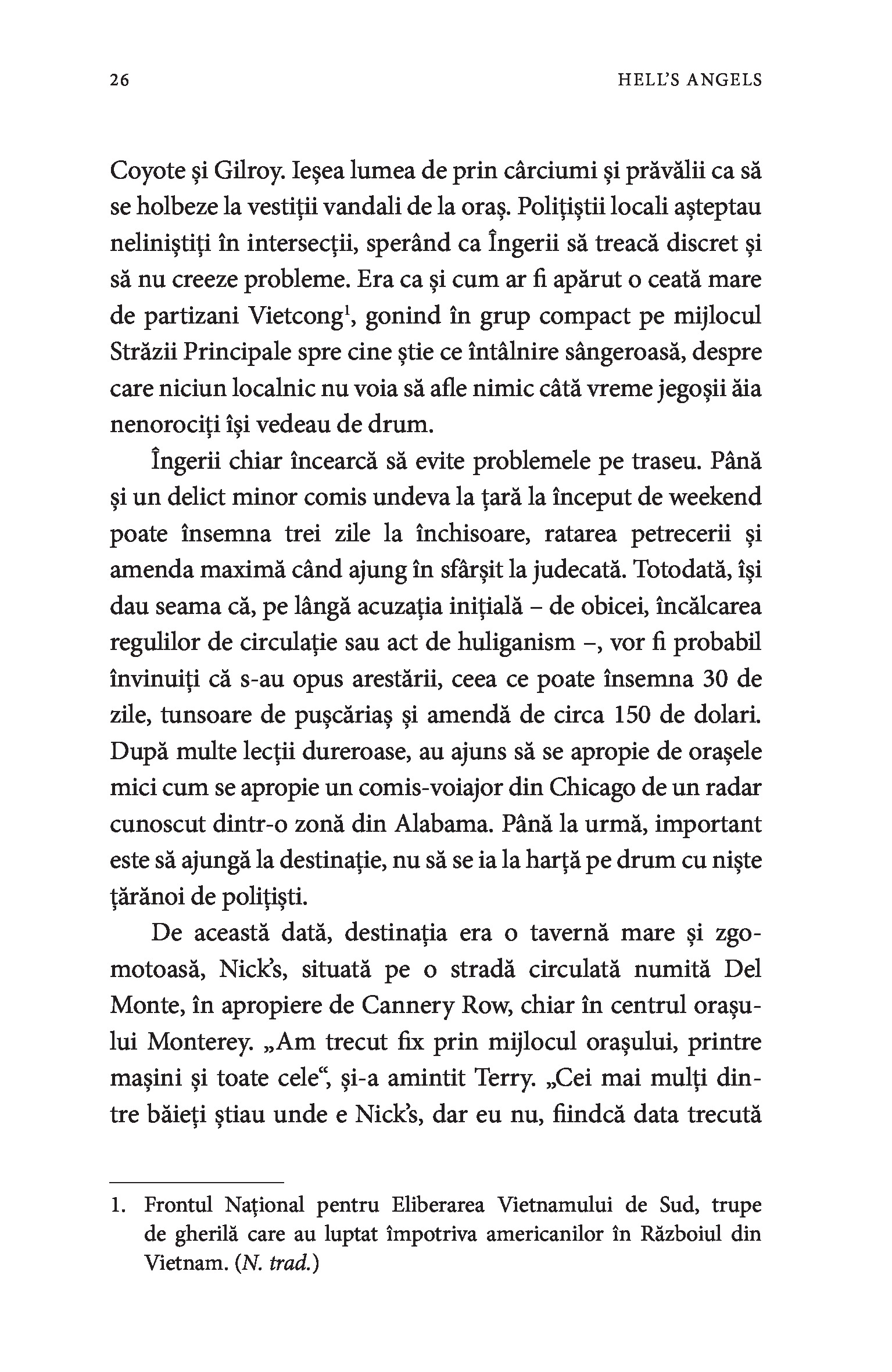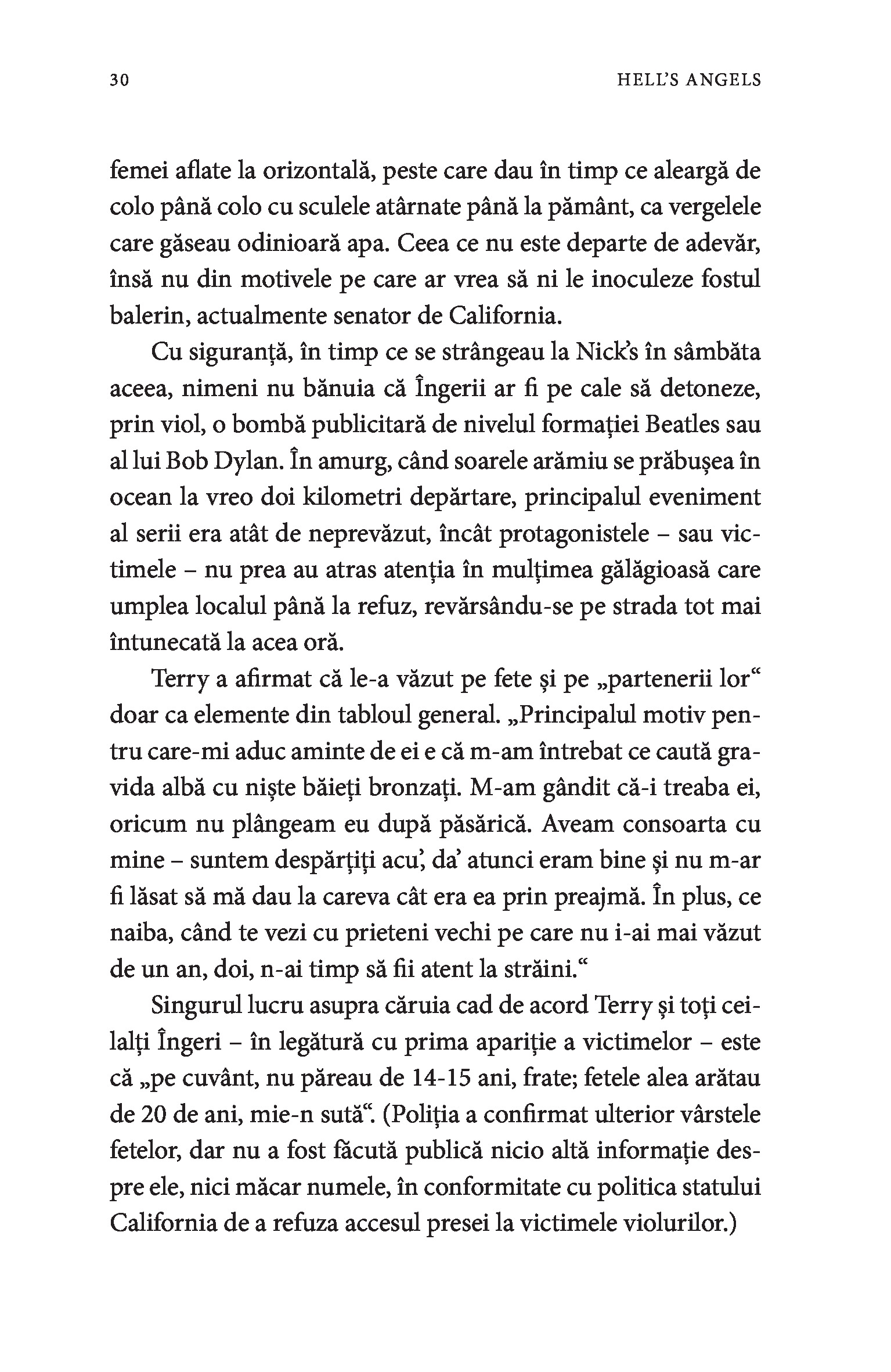 Hell’s Angels este și o carte despre Hunter S. Thompson, scriitorul care a stat peste un an în mijlocul Îngerilor, împreună cu care a călătorit, a participat la raiduri, a băut tone de bere și s-a drogat. Cu unii s-a împrietenit, alții l-au privit mereu cu neîncredere. Cu toate că nu s-a integrat niciodată complet în grupul lor, Thompson a ajuns să îi înțeleagă mai bine decât oricine pe acești nonconformiști.