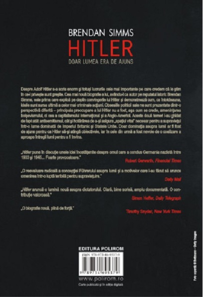 Despre Adolf Hitler s-a scris enorm şi totuşi lucrurile cele mai importante pe care credem că le ştim în ce-l priveşte sunt greşite. Cea mai nouă biografie a lui, avându-l ca autor pe reputatul istoric Brendan Simms, este prima care explică pe deplin convingerile lui Hitler şi demonstrează cum, ca întotdeauna, ideile sunt sursa ultimă a celor mai criminale acţiuni. Obsesiile politicii sale ne sunt prezentate dintr-o perspectivă diferită – principala preocupare a lui Hitler nu a fost, aşa cum se crede, ameninţarea bolşevismului, ci cea a capitalismului internaţional şi a Anglo-Americii. Aceste două temeri i-au ghidat de fapt atât antisemitismul, cât şi hotărârea de a-şi asigura „spaţiul vital” necesar pentru a supravieţui într-o lume dominată de Imperiul Britanic şi Statele Unite. Doar dominaţia asupra lumii ar fi fost de ajuns pentru ca Hitler să-şi atingă obiectivele, iar în cele din urmă a fost nevoie de o coalizare a aproape întregii lumi pentru a fi învins.