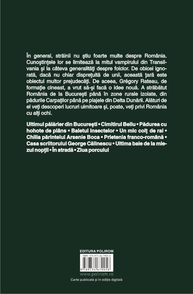 În general, străinii nu ştiu foarte multe despre România. Cunoştinţele lor se limitează la mitul vampirului din Transilvania şi la cîteva generalităţi despre folclor. De obicei ignorată, dacă nu chiar dispreţuită de unii, această ţară este obiectul multor prejudecăţi. De aceea, Grégory Rateau, de formaţie cineast, a vrut să-şi facă o idee nouă. A străbătut România de la Bucureşti pînă în zone rurale izolate, din pădurile Carpaţilor pînă pe plajele din Delta Dunării. Alături de el veţi descoperi lucruri uimitoare şi, poate, veţi privi România cu alţi ochi.