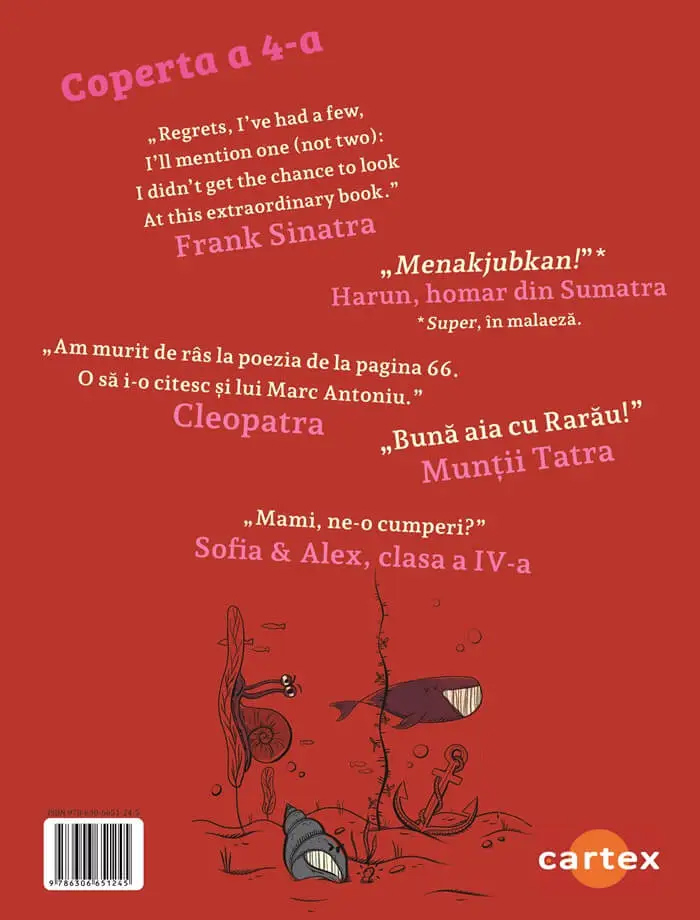 Poeziile lui Carmen Tiderle sunt forme de arta a expresiei care isi gasesc originea in cantecele antice. Toate textele poetice se folosesc de puterea cuvintelor, de jocul simturilor, de muzica sunetelor, de aranjarea rimelor si de ruperi de ritm. Ce reuseste Carmen este, fara indoiala, sa se furiseze abil in camera de joaca a mintii copilului de azi, iar asta e o operatiune aproape imposibila… Iar desenele lui David Petridean pun intr-o expresie grafica nu textul sau ideea, ci insasi starea de gratie poetica.