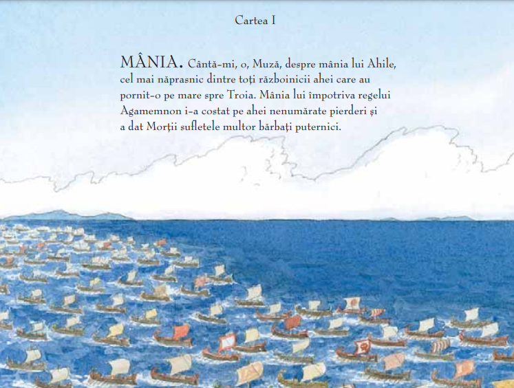 În acest roman grafic extrem de bine documentat şi realizat cu desăvârşită măiestrie, binecunoscutul ilustrator Gareth Hinds reuşeşte să redea întreg dramatismul epopeii homerice. Ilustraţiile dinamice îi poartă pe cititori drept în vâltoarea luptei şi înfăţişează trăirile oamenilor şi zeilor ale căror strădanii ţin vie făclia războiului şi îi hotărăsc soarta.