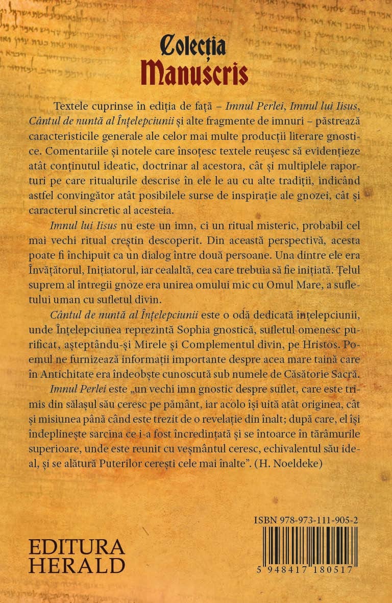 Textele cuprinse in editia de fata - Imnul Perlei, Imnul lui Iisus, Cantul de nunta al Intelepciunii si alte fragmente de imnuri - pastreaza caracteristicile generale ale celor mai multe productii literare gnostice. Comentariile si notele care insotesc textele reusesc sa evidentieze atat continutul ideatic, doctrinar al acestora cat si multiplele raporturi pe care ritualurile descrise in ele le au cu alte traditii, indicand astfel convingator posibilele surse de inspiratie ale gnozei cat si caracterul sincretic al acesteia.