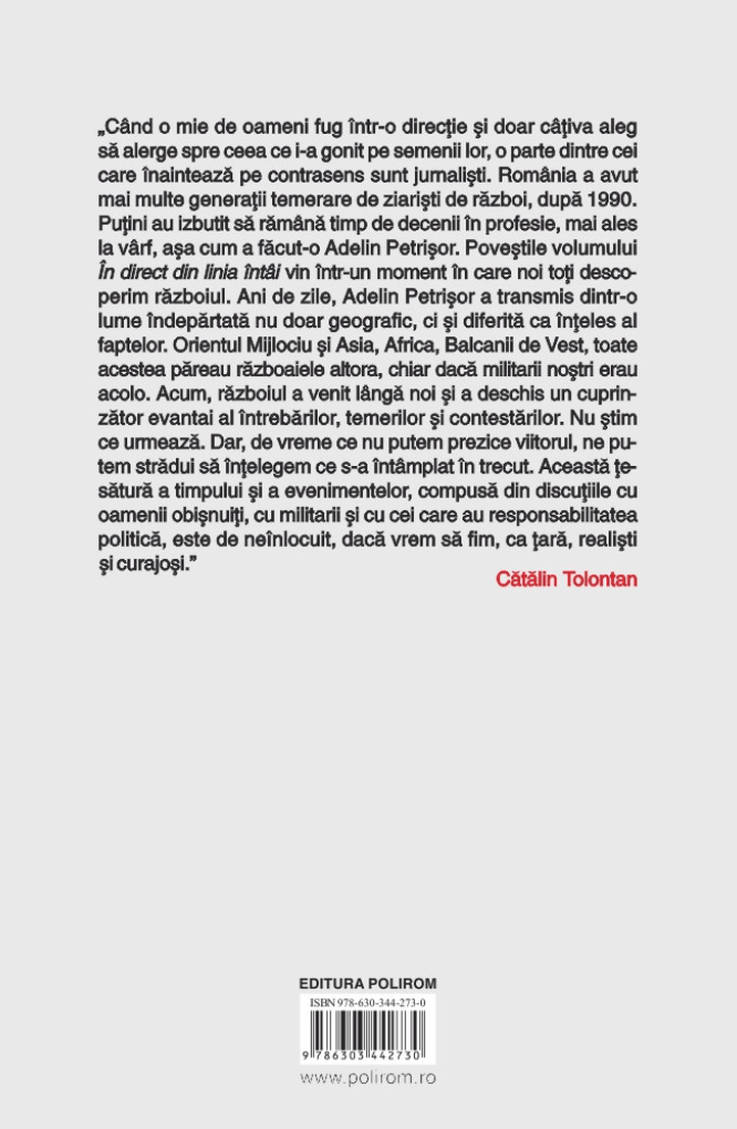 Poveștile volumului În direct din linia întâi vin într-un moment în care noi toți descoperim războiul. Ani de zile, Adelin Petrișor a transmis dintr-o lume îndepărtată nu doar geografic, ci și diferită ca înțeles al faptelor. Orientul Mijlociu și Asia, Africa, Balcanii de Vest, toate acestea păreau războaiele altora, chiar dacă militarii noștri erau acolo. Acum, războiul a venit lângă noi și a deschis un cuprinzător evantai al întrebărilor, temerilor și contestărilor. Nu știm ce urmează. Dar, de vreme ce nu putem prezice viitorul, ne putem strădui să înțelegem ce s-a întâmplat în trecut.